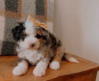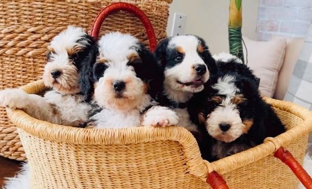 Our Bernedoodle puppies include mini and medium sizes. Goldendoodle puppies include petite and miniature sizes. Sizes will vary depending on the parent dogs.