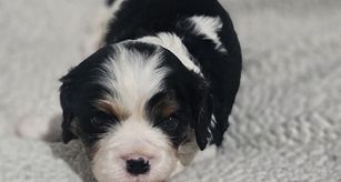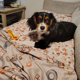 Purity is a gorgeous DNA tested blue eyed little beauty! She is a wonderful mix of a King Charles Spaniel and a Miniature Australian Shepard ASDR registered. Together they made this amazing little Momma and she is truly beautiful! This picture is her as a baby! Just to showcase her youth and beauty.