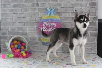Pomsky puppies include tri-color, silver and white, gray and white, and black and white. Companion Cross puppies include blue and black and white. Colors will vary depending on the parent dogs.