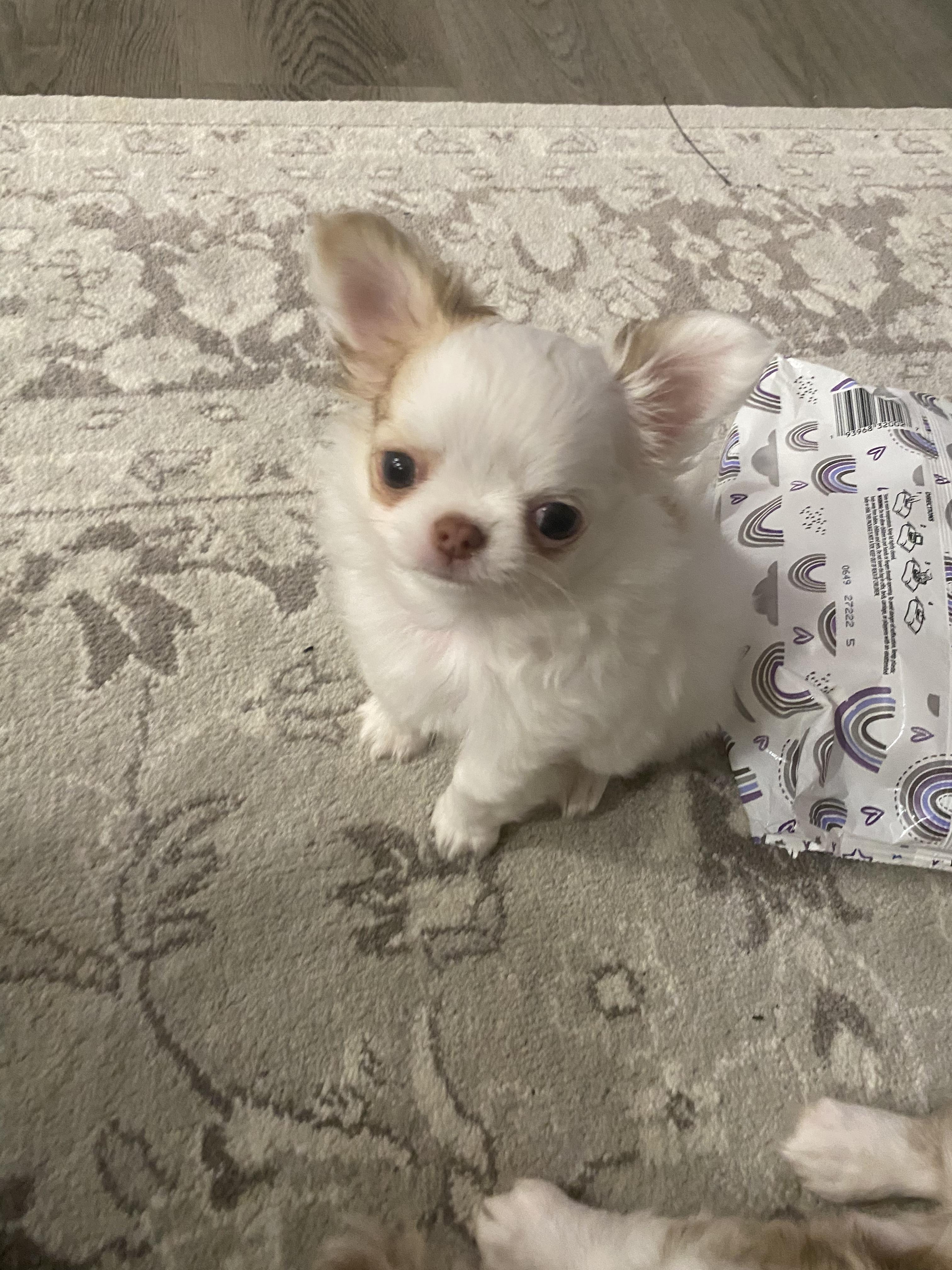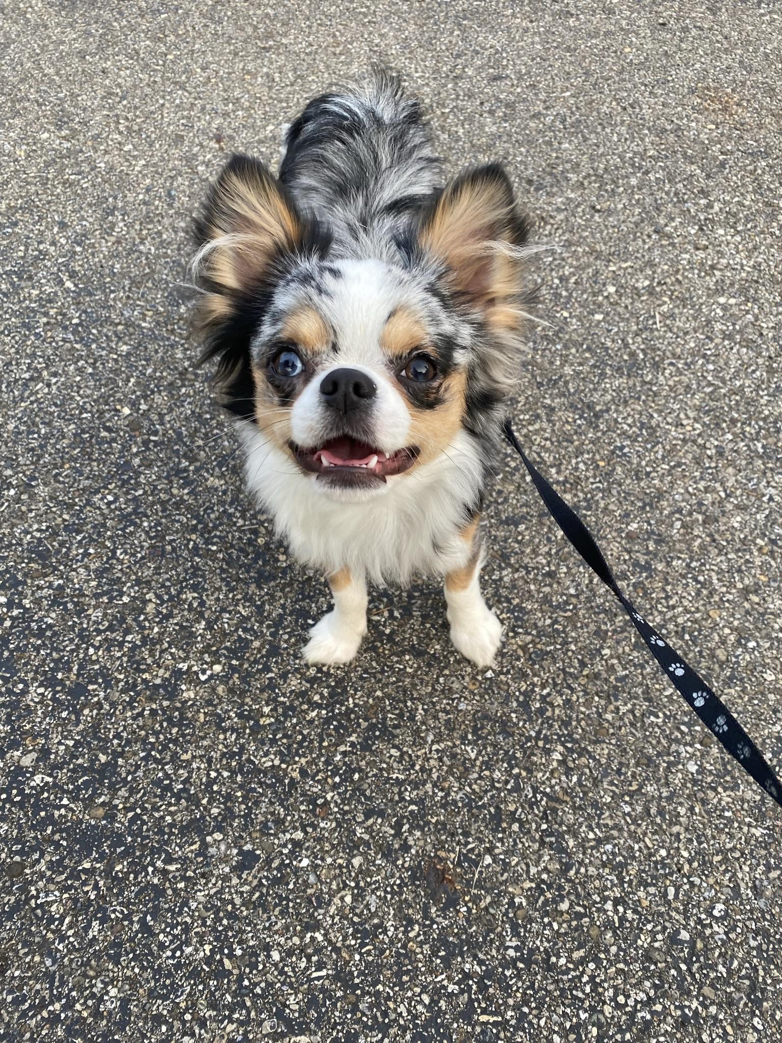 Muffin is our beautiful long-haired, merle spotted-on-white Chihuahua. She’s our shy and reserved girl at heart, but once you get to know her, she’s all love and sweetness. Muffin comes to life around the other dogs—playful, spirited, and full of fun! She’s also incredibly gentle and nurturing, especially with the puppies, always patient and kind. Muffin brings a calm and loving presence to our pack.