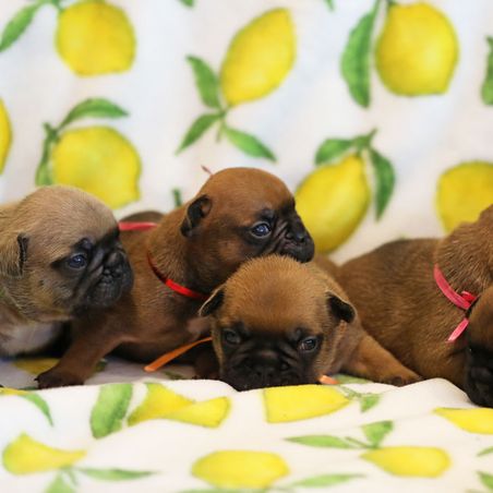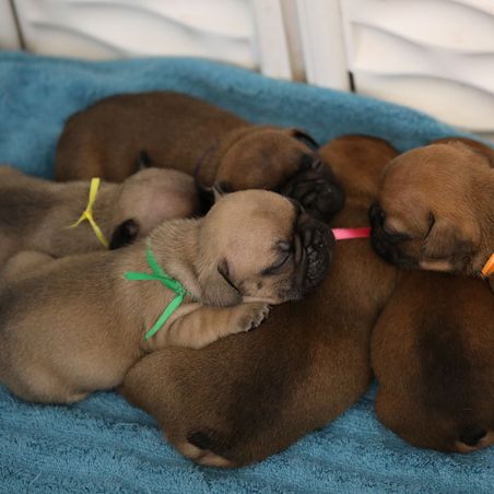 Our puppies include brindle, cream, fawn, white and brindle, fawn and white, and brindle and white. Colors will vary depending on the parent dogs.