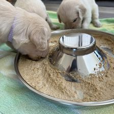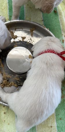 Puppies are 4.5 weeks old and eating mush like champs! They love playing outside and jumping through the water. They are experiencing new play objects and sounds each day.