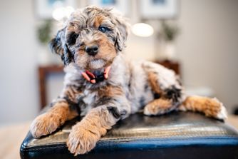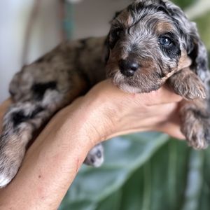 Phoebe is a 60 lbs First Generation Phantom Bernedoodle born in Chandler, AZ. She's 2.5 years old and is a new mom to her first litter of 10 F1B Berne "Double" Doodles. She's a happy-go-lucky sweetheart that loves all animals and people. As a Working Group breed, Berners like to rest quietly until activated for family play, guarding, or farm work. She especially likes to be flat on her belly on the cool floor or under a tree when it's not too hot out.