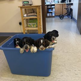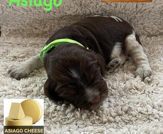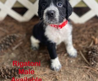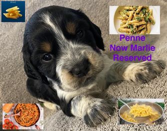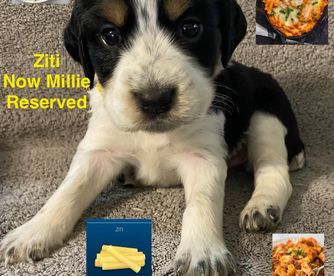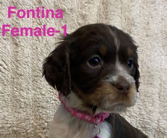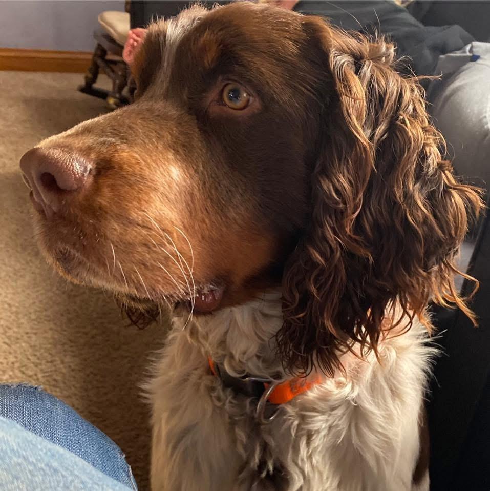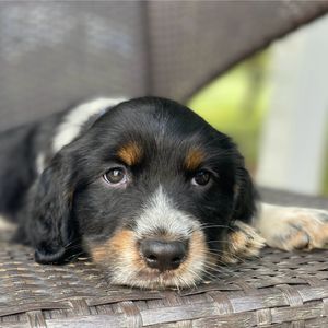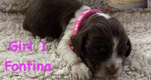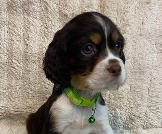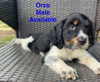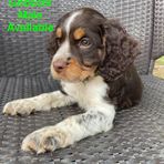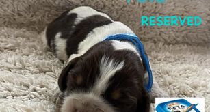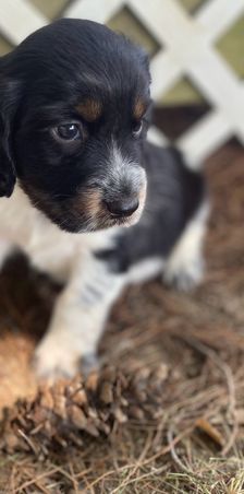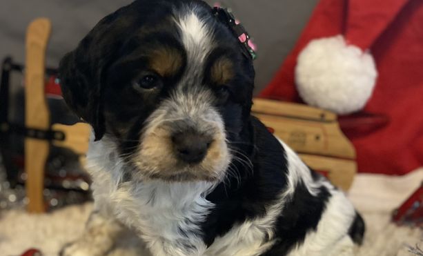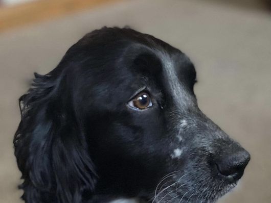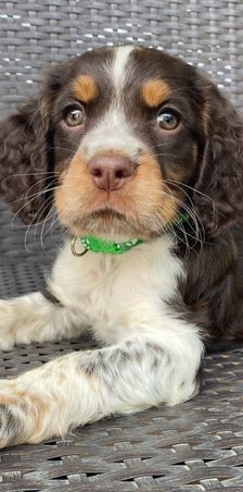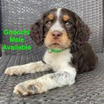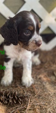 Darcy is a black (blue) roan English springer spaniel. She loves swimming and anything to do with water. She loves playing outside or snuggling up on the couch. She is AKC registered and has been genetically tested and clear!