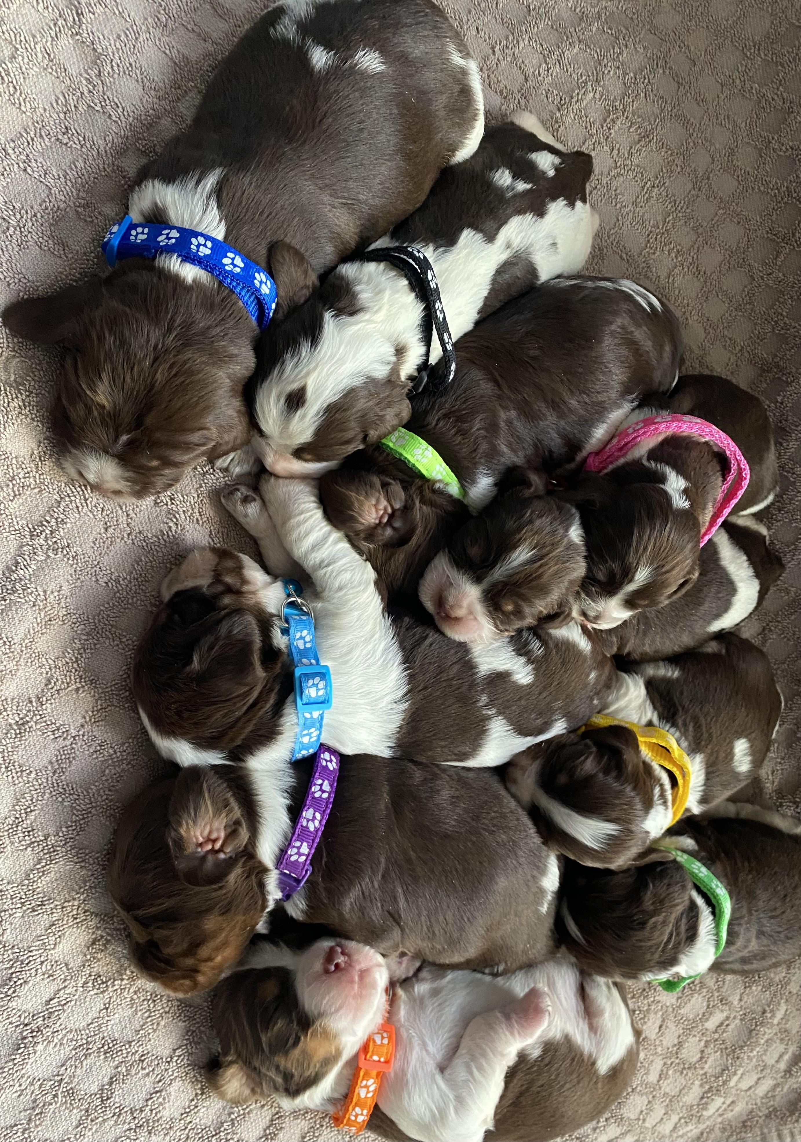 Our puppies include black white and tan, liver white and tan, white and liver, and black and white. Colors will vary depending on the parent dogs.