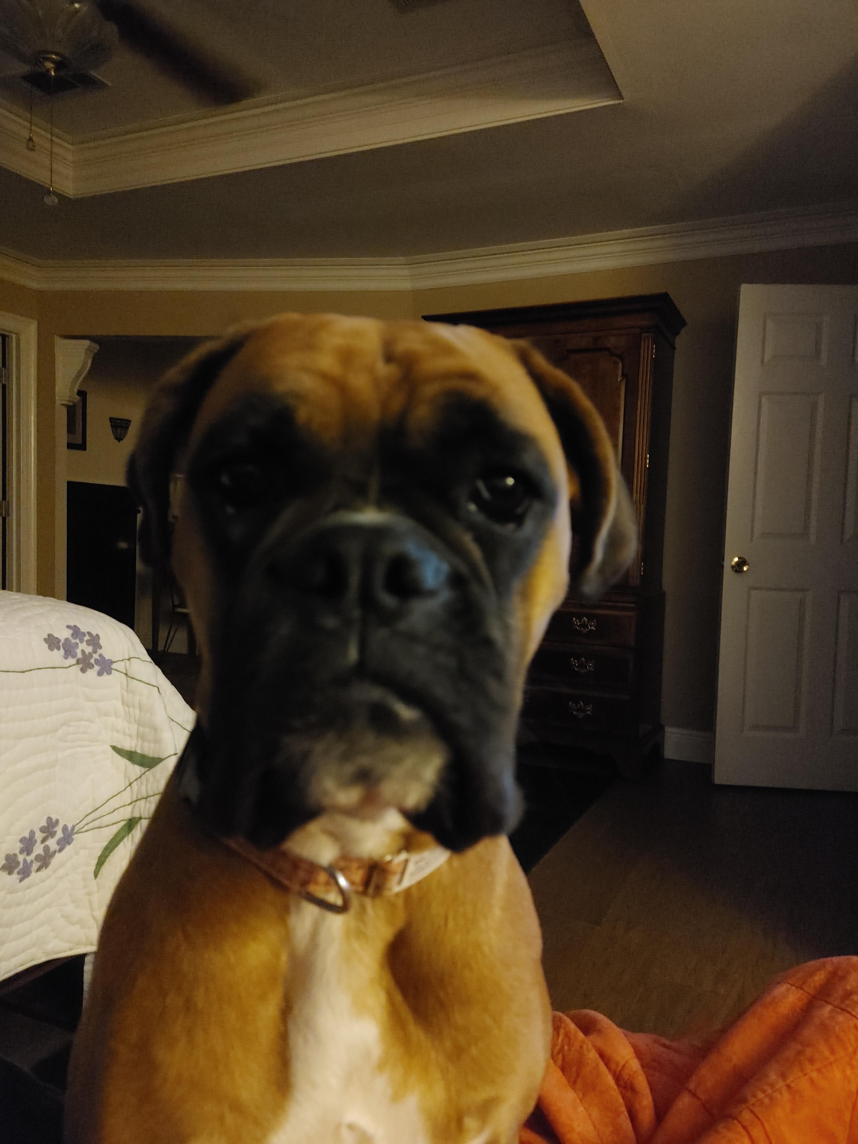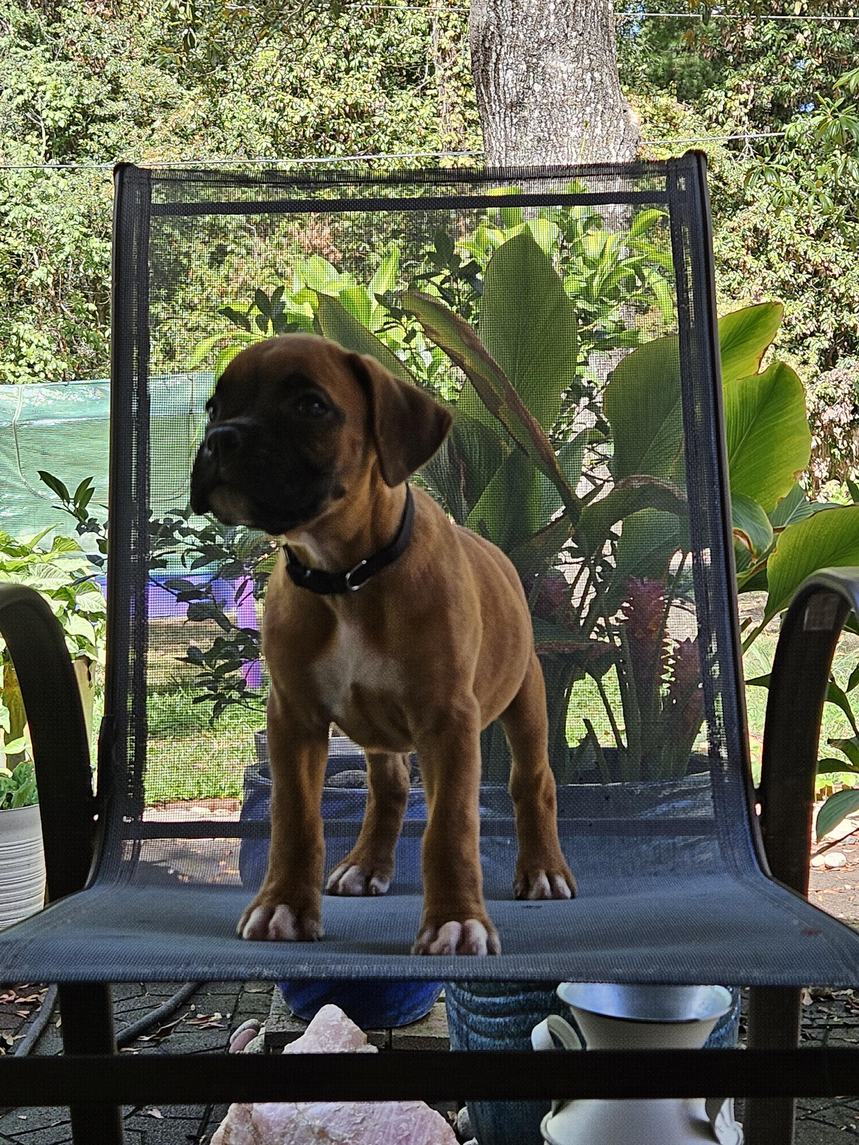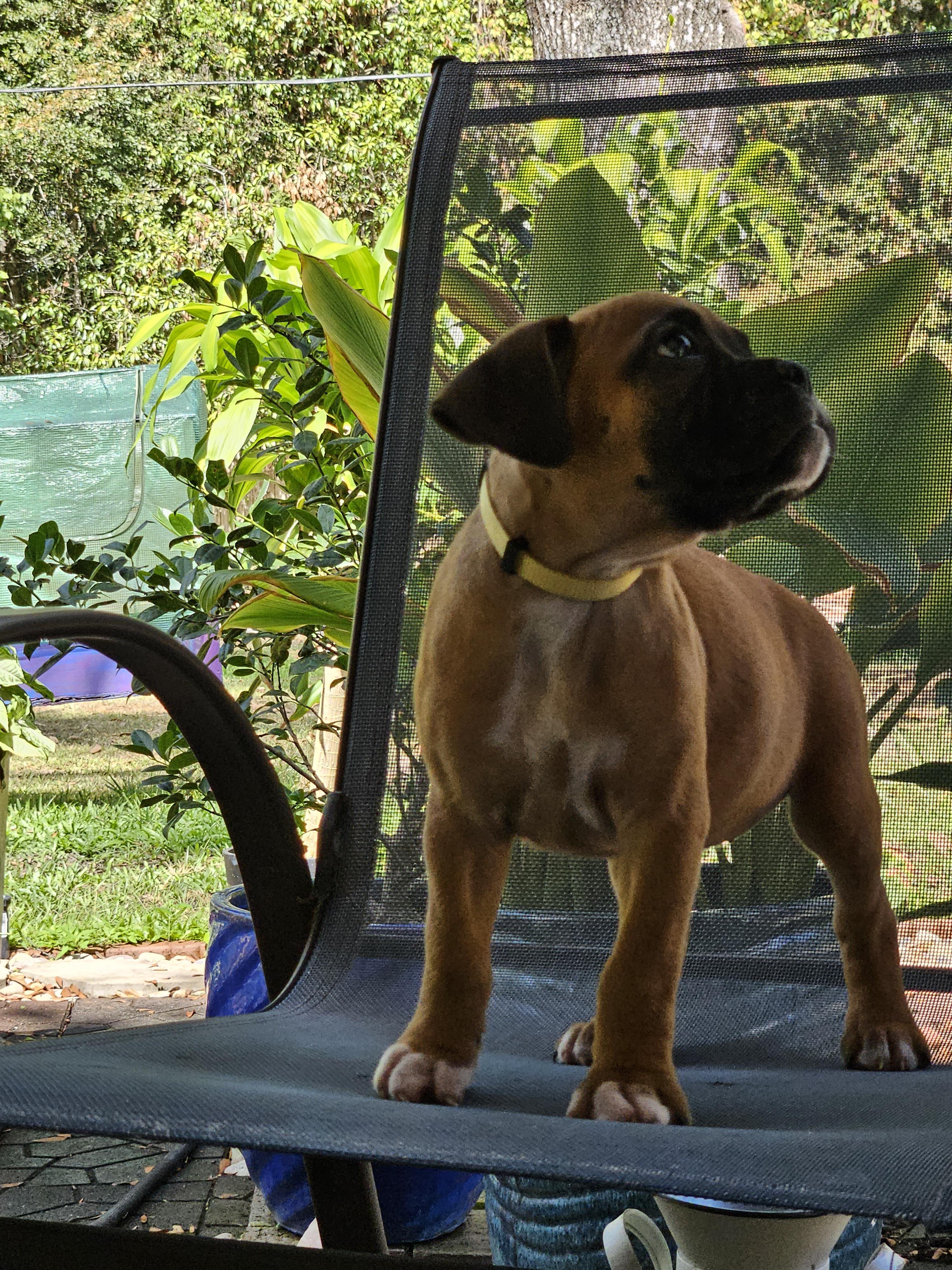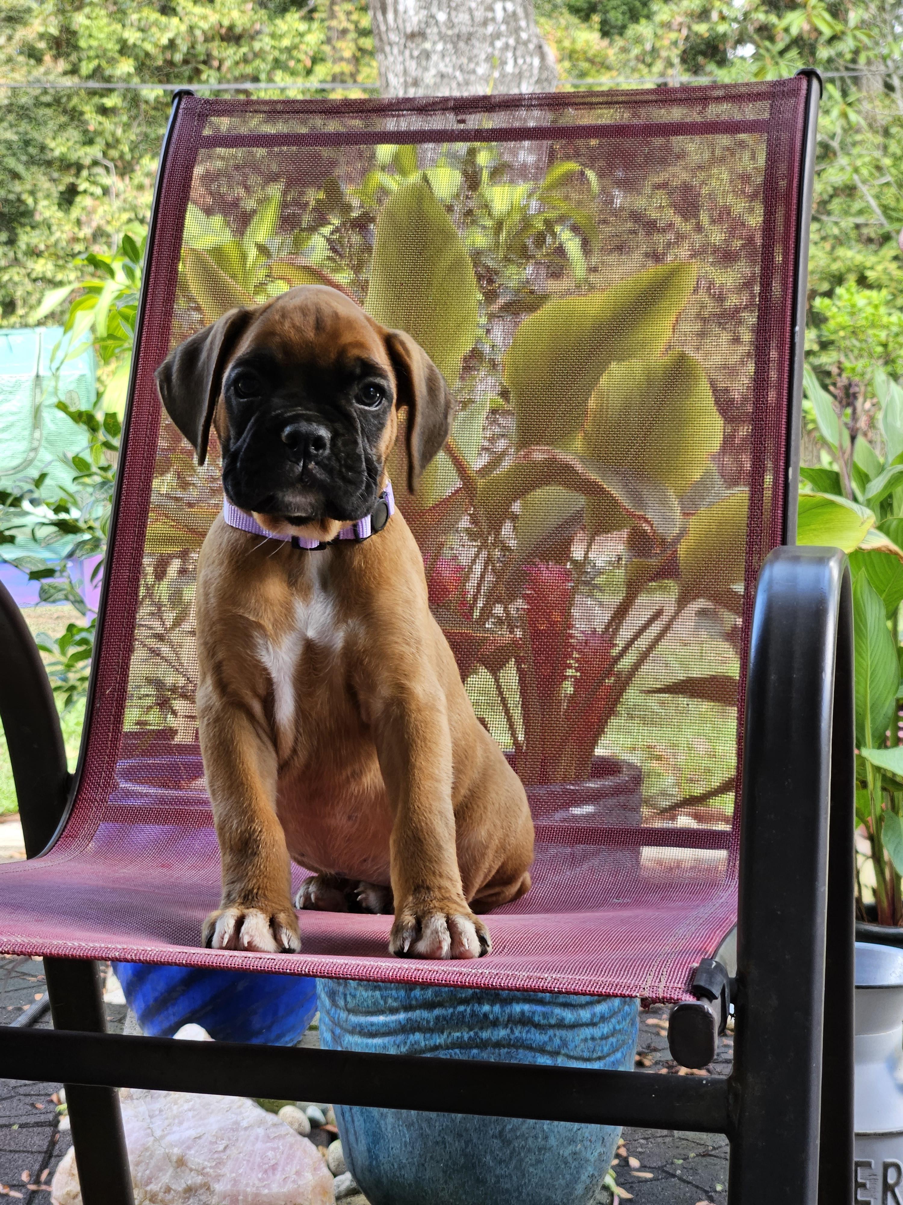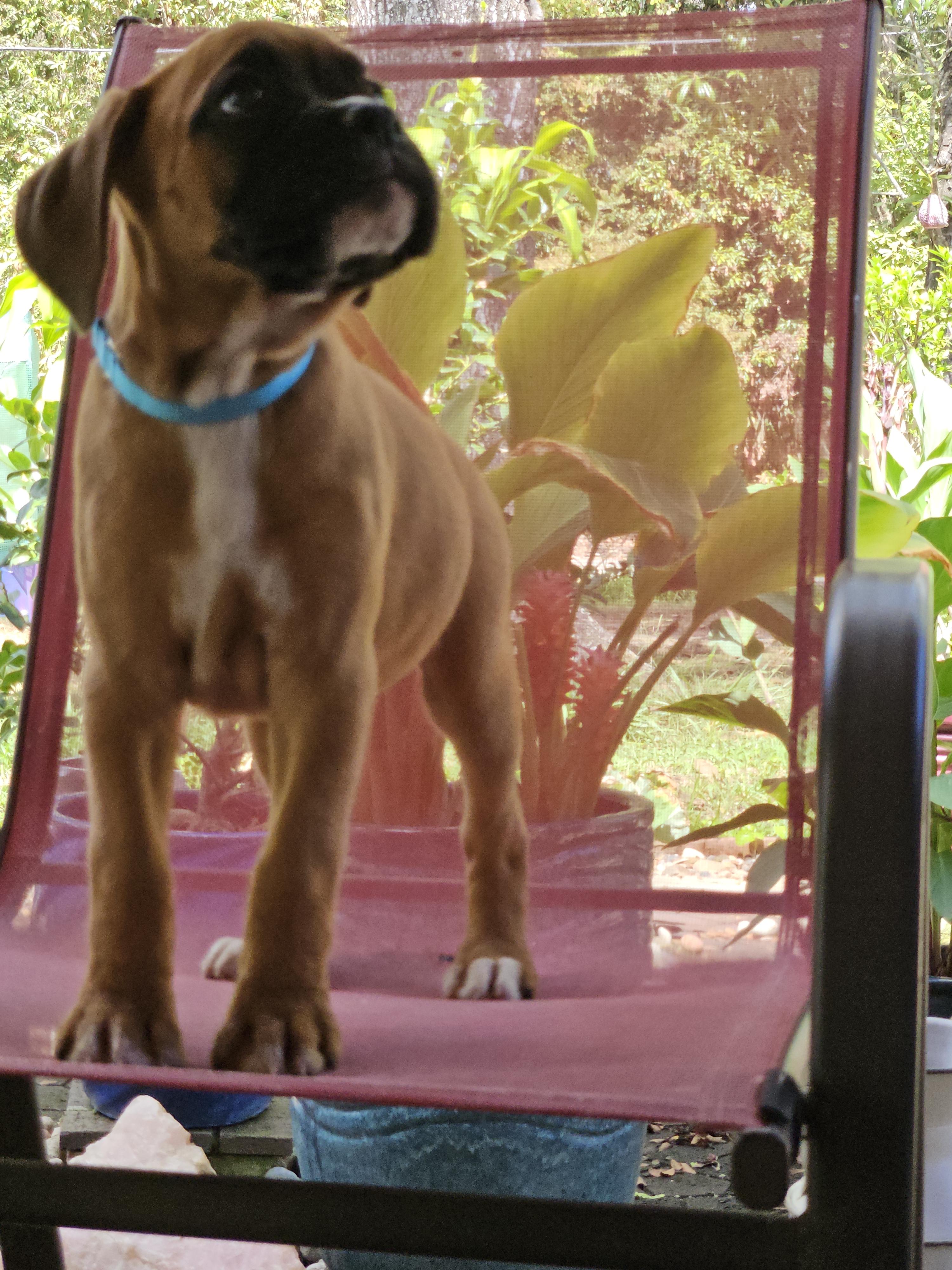 Missy is the sweetest fun-loving boxer. She always brings a "gift" for you, whether it is her favorite toy, stick or pinecone, she fines something for you. Loves to be petted and lie on your feet. Always watchful.