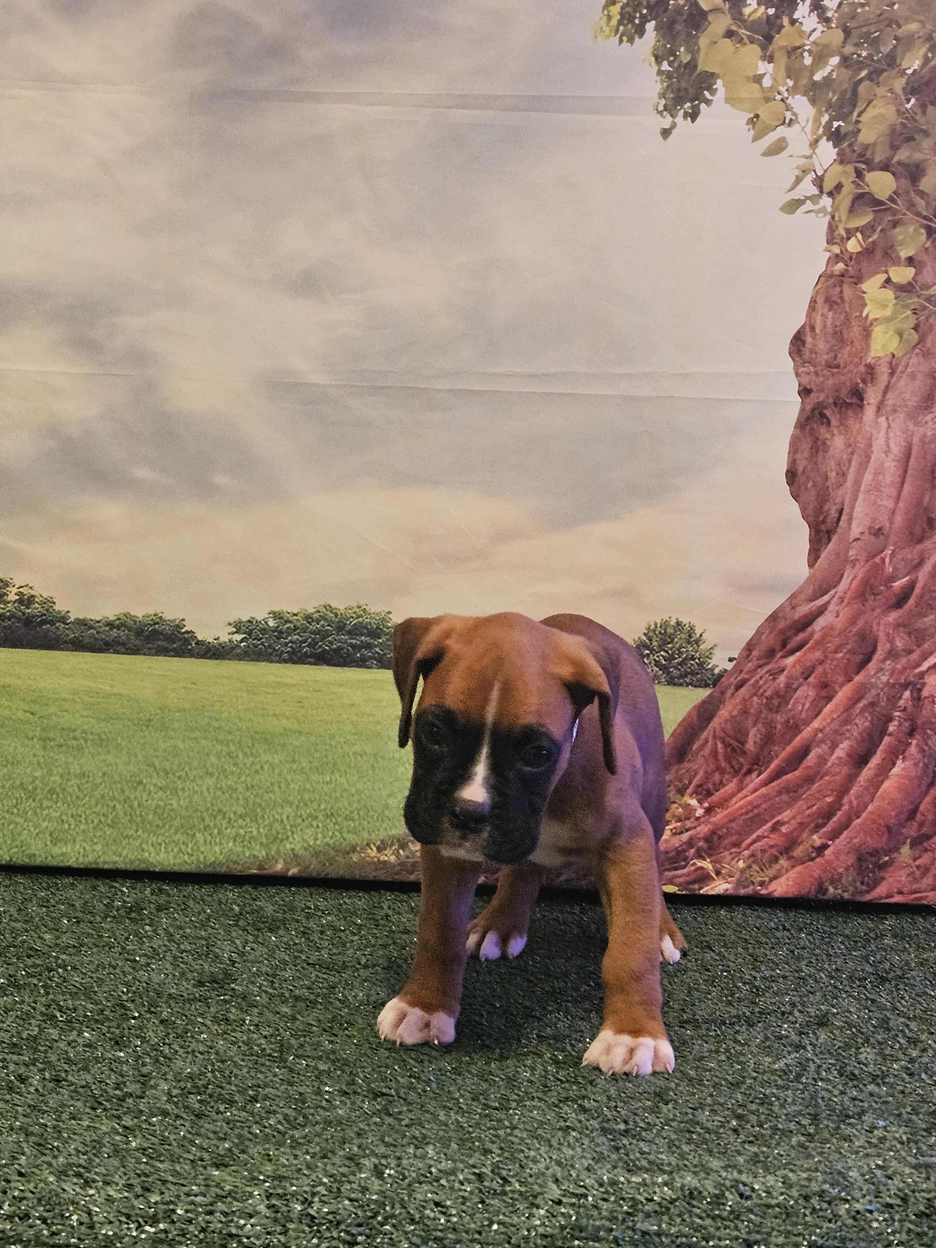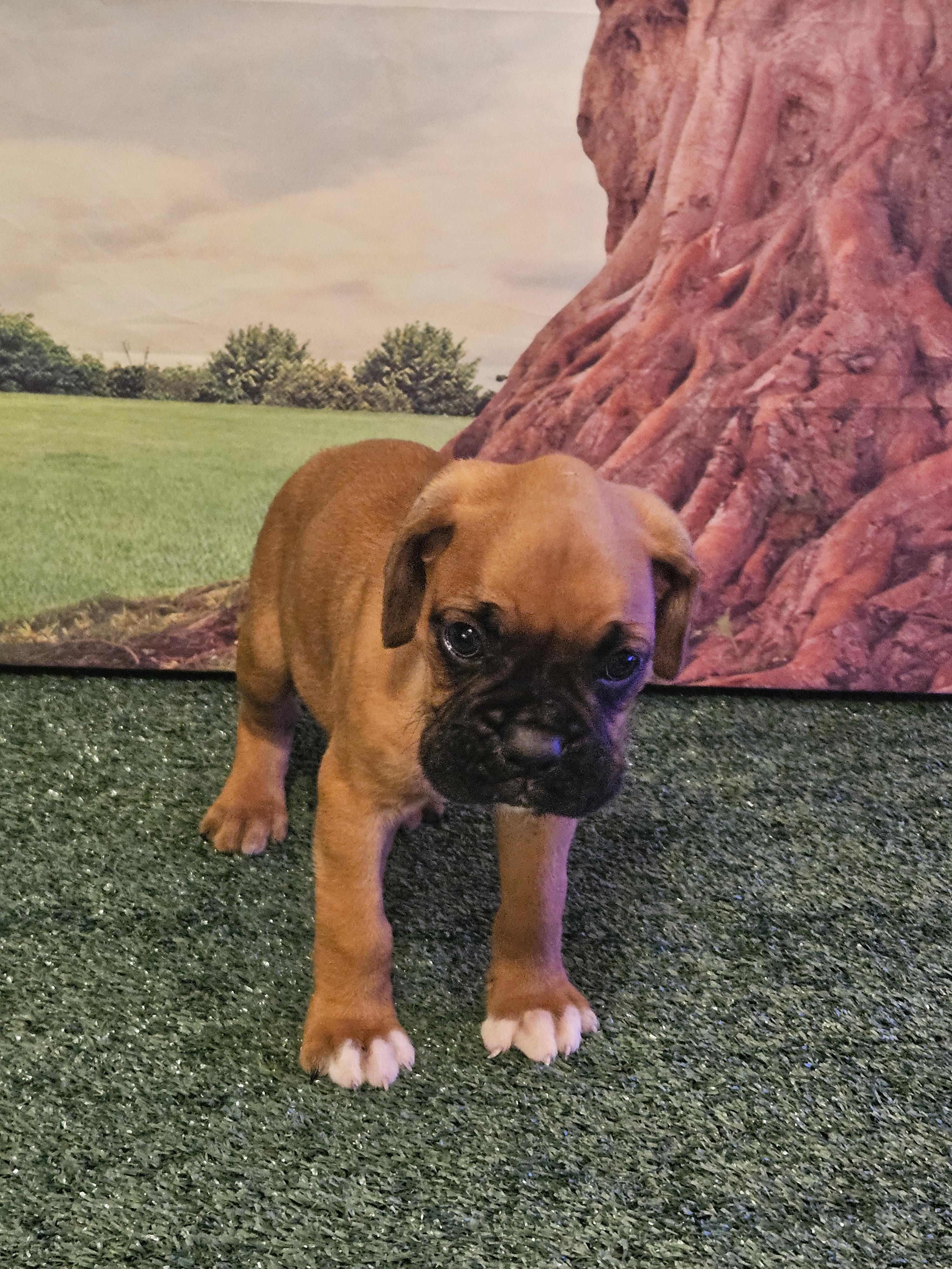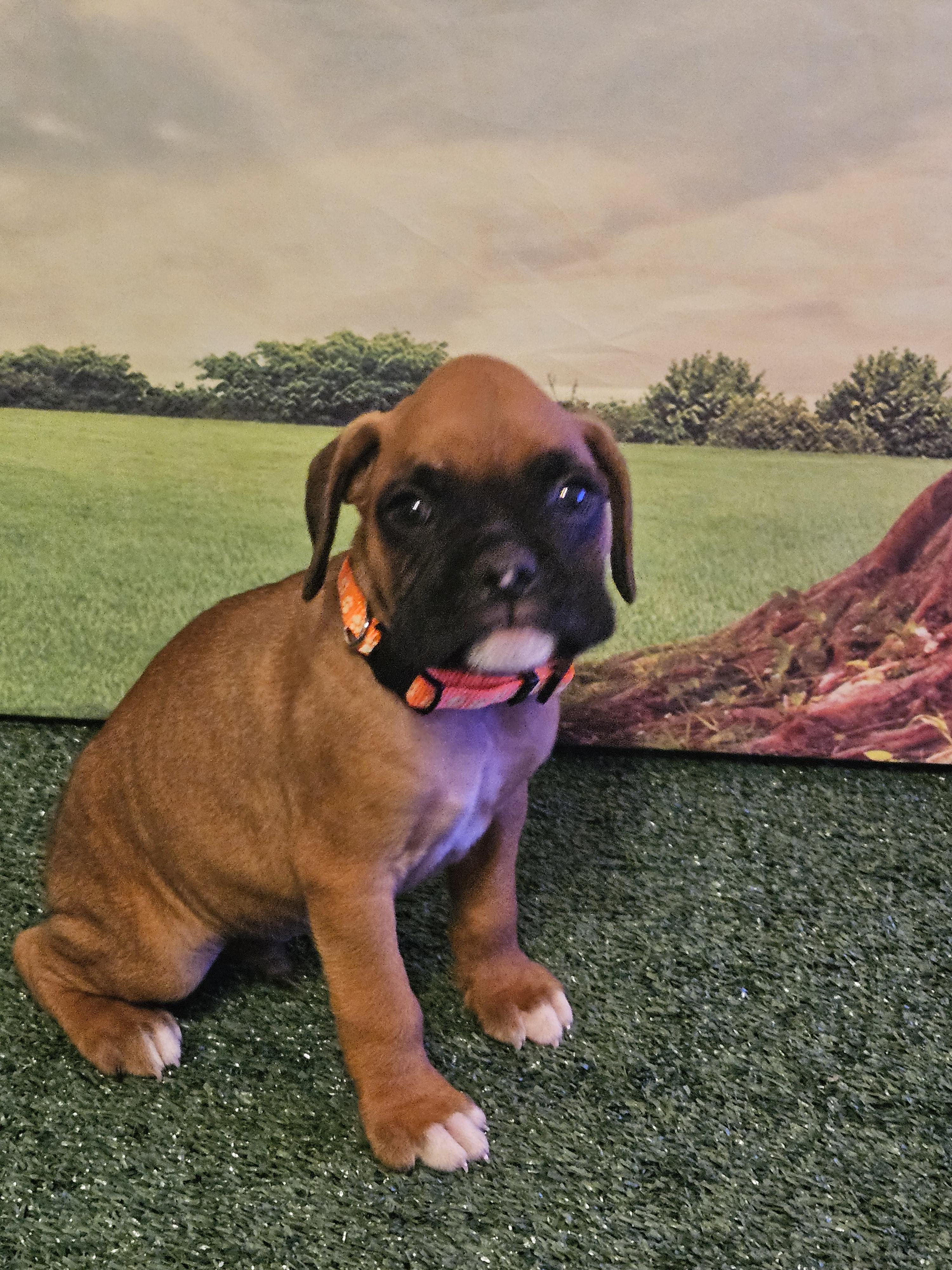 Our Miniature Pinscher puppies include red, chocolate and tan, and black and tan. Boxer puppies include fawn and brindle. Colors will vary depending on the parent dogs.