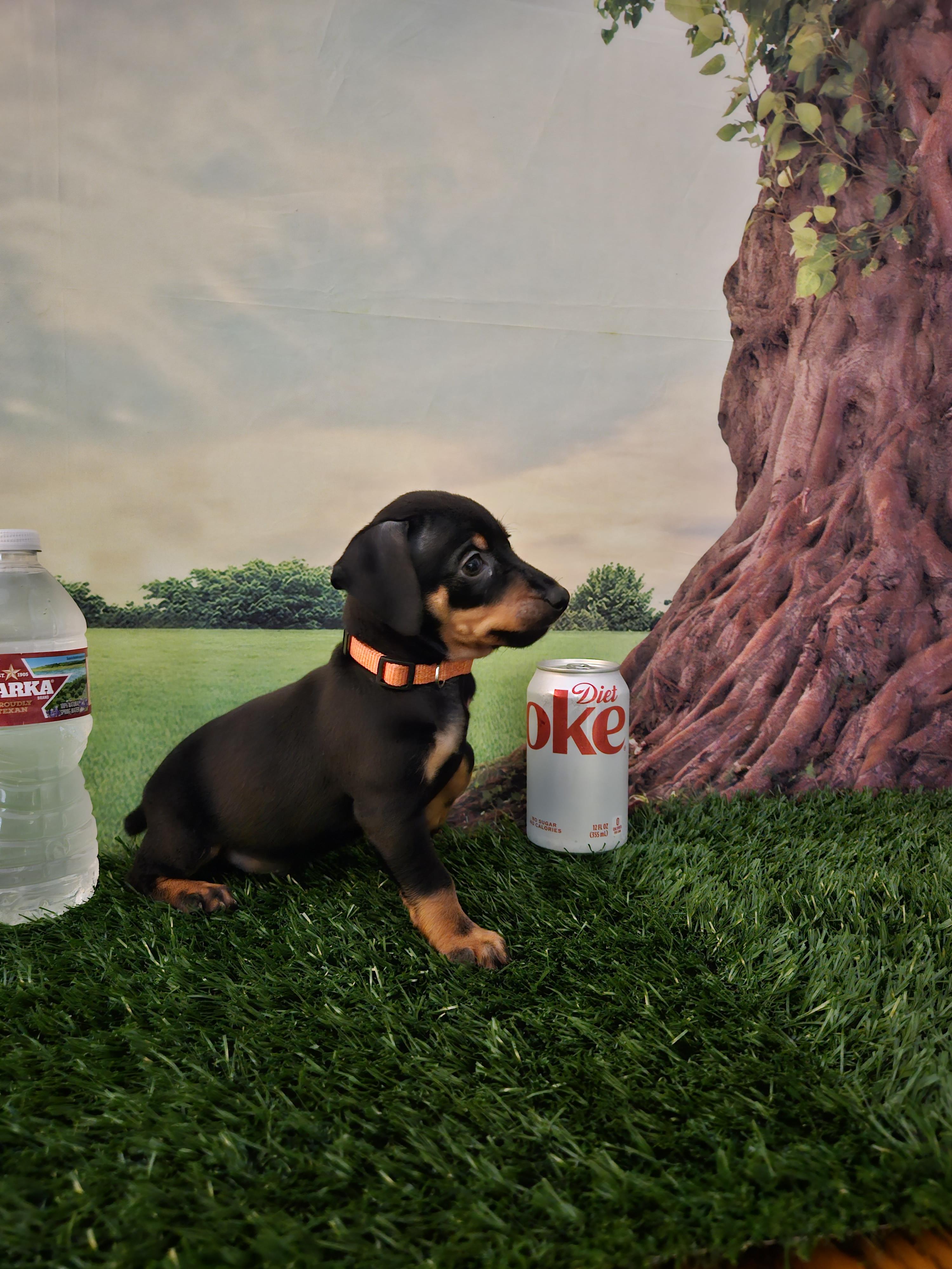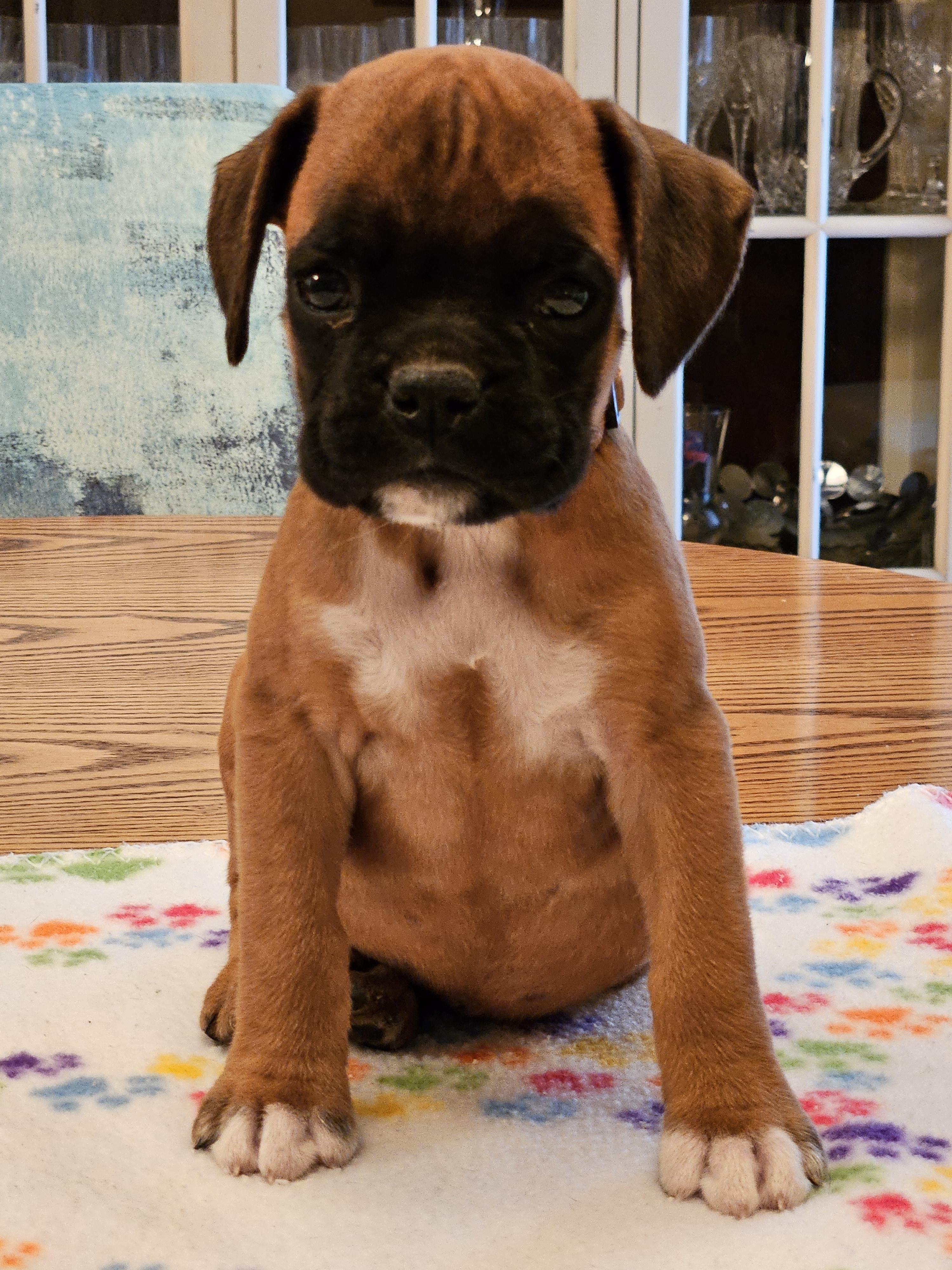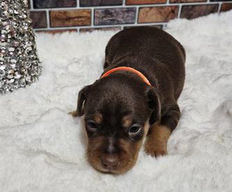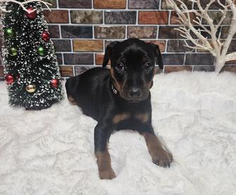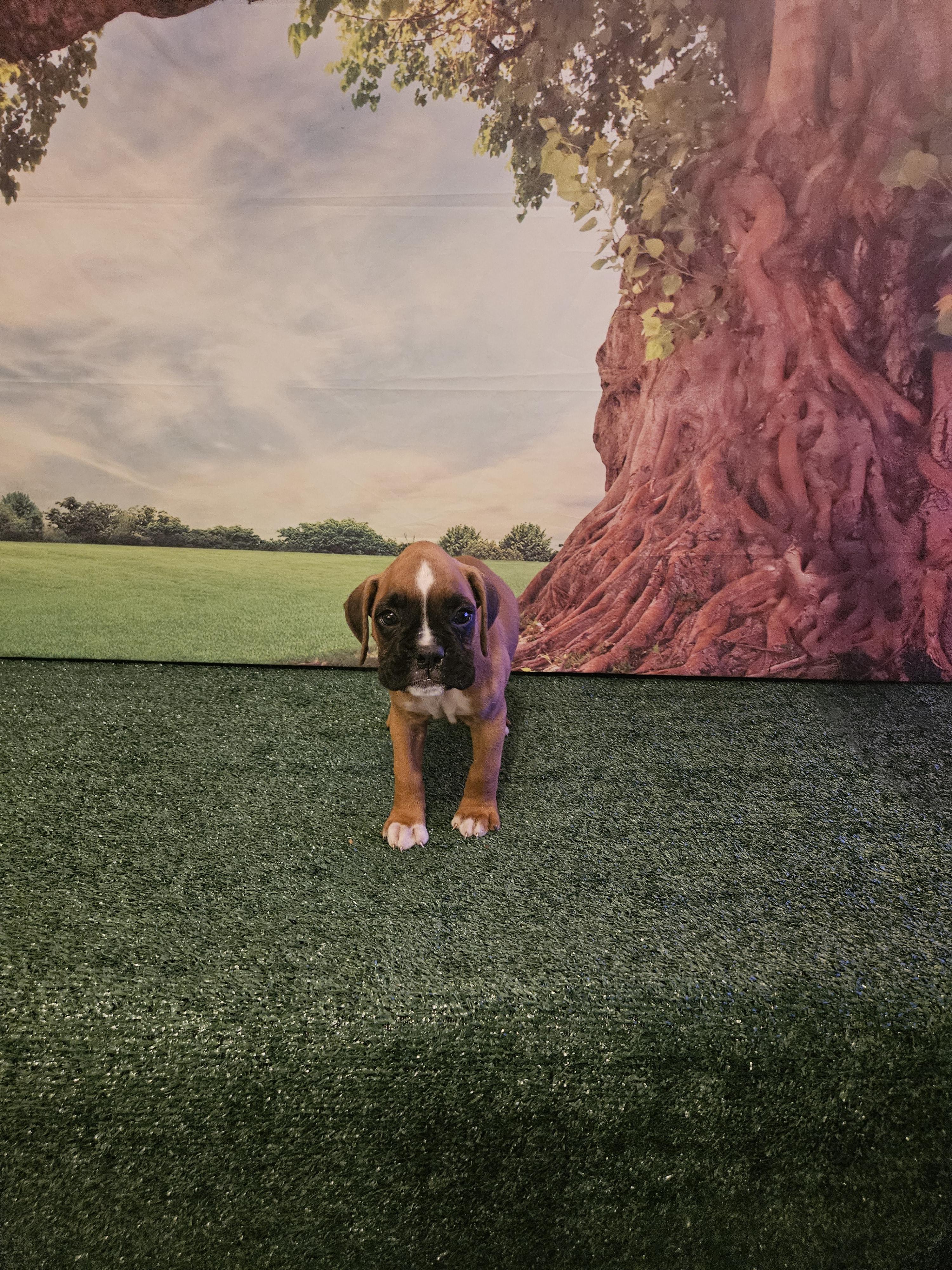 Our Miniature Pinscher puppies include red, chocolate and tan, and black and tan. Boxer puppies include fawn and brindle. Colors will vary depending on the parent dogs.