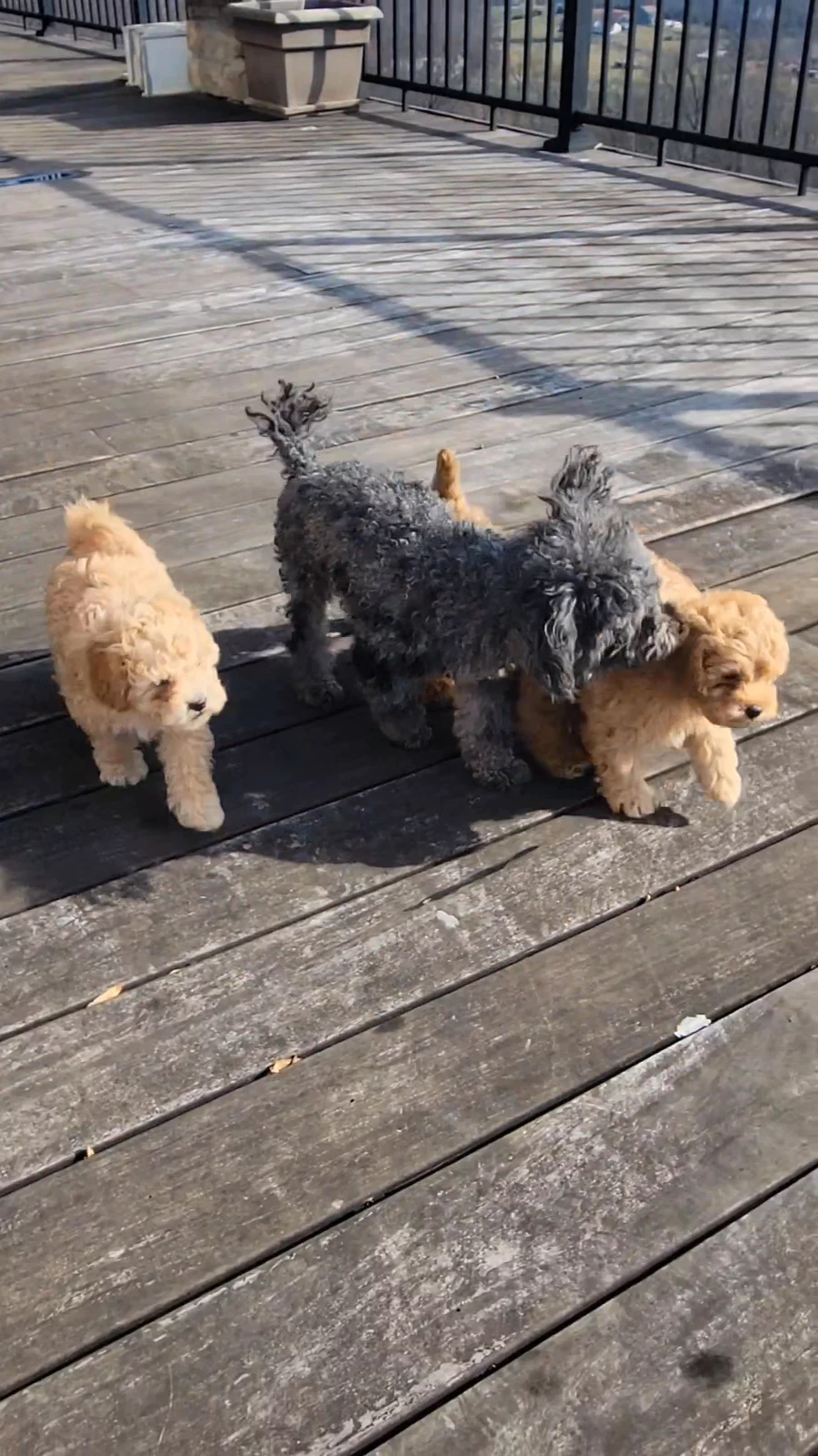 Our Shichon puppies include brown, cream, and black and white. Shihpoo puppies include brown, silver, and red. Australian Shepherd puppies include blue merle and black tri-color. Colors will vary depending on the parent dogs.