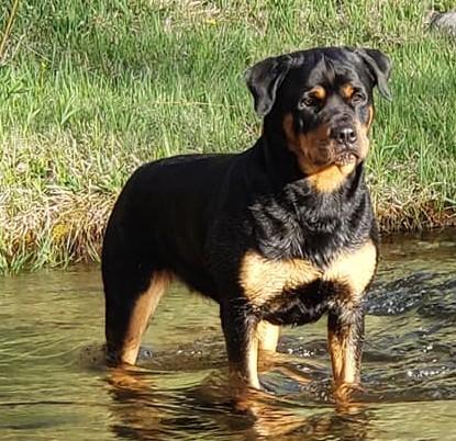Splash is a female Rottweiler. Carefully selected as a great representative of her breed, Julie decided to make her part of their program. Julie has passed Good Dog’s screening process, which involved a review of their breeding practices, environment, and the mental and physical health of their dogs.