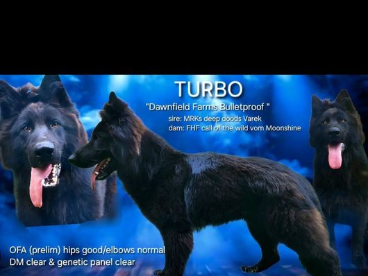OFA hips fair, elbows normal, cardiac clear, DM carrier & full dentition. AKC DNA