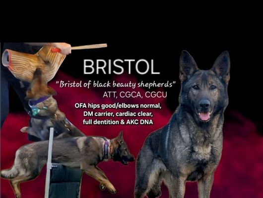 Bristol is a fire cracker & with such high drive, she makes it super easy to teach her new things. She has a great personality and is so eager to please! Bristol has an easy going demeanor, and displays the utmost confidence anywhere she goes! She is so much fun to be around and loves everyone she meets. She will produce puppies with stable, bidable temperments willing to please! Bristol earned her CGC (canine good citizen) at 12 months old! She has also earned her ATT (American Temperment Test) CGCA & CGCU! (Advanced & Urban).
