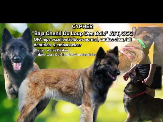 Cypher is our belgian tervuren, she comes from impressive working malinois lines and has earned her CGC (canine good citizen) at 9 months old! She also passed& earned her ATT (American Temperment Test). & is currently training for her PSA PDC! She is so much fun to work!