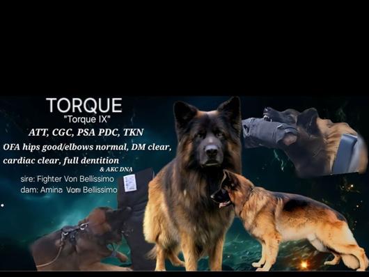 Torque is a stunning, black and red, long coated West German Show Line. With parents directly imported from Europe, he has an impressive pedigree of mostly working and some show bloodlines!! He possess a protective demeanor, but is very social and trusted in crowded environments, under proper handler control! Torque is a low to medium drive dog, which makes him the ultimate couch potato on cold,rainy days, but is always up for a camping trip, hike, swim or some ball time! Torque achieved his ATT, CGC & TKN certifications all at a year old!!