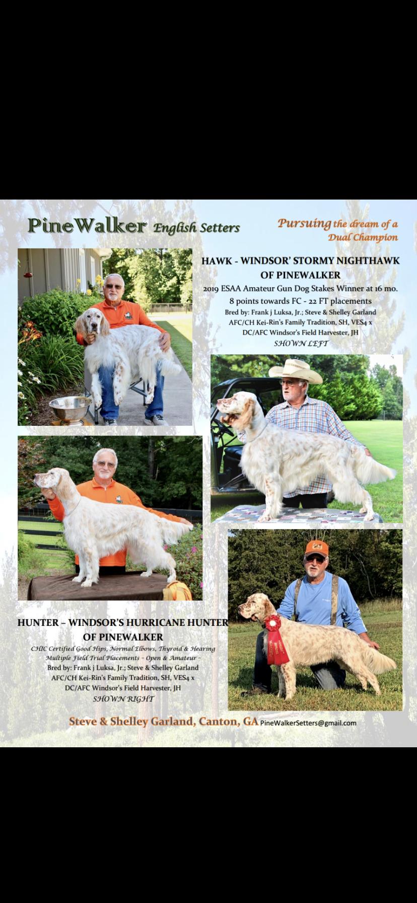 I'm Shelley G., the breeder behind Pinewalker English Setters located in Georgia. Our dogs excel both in and out of the show ring. They are excellent representations of the breed and have wonderful temperaments. We are very conscious about who we offer our stud services to and always ensure that each pairing will produce healthy puppies with great temperaments and structure. We are proud to have a part in preserving this historic breed.