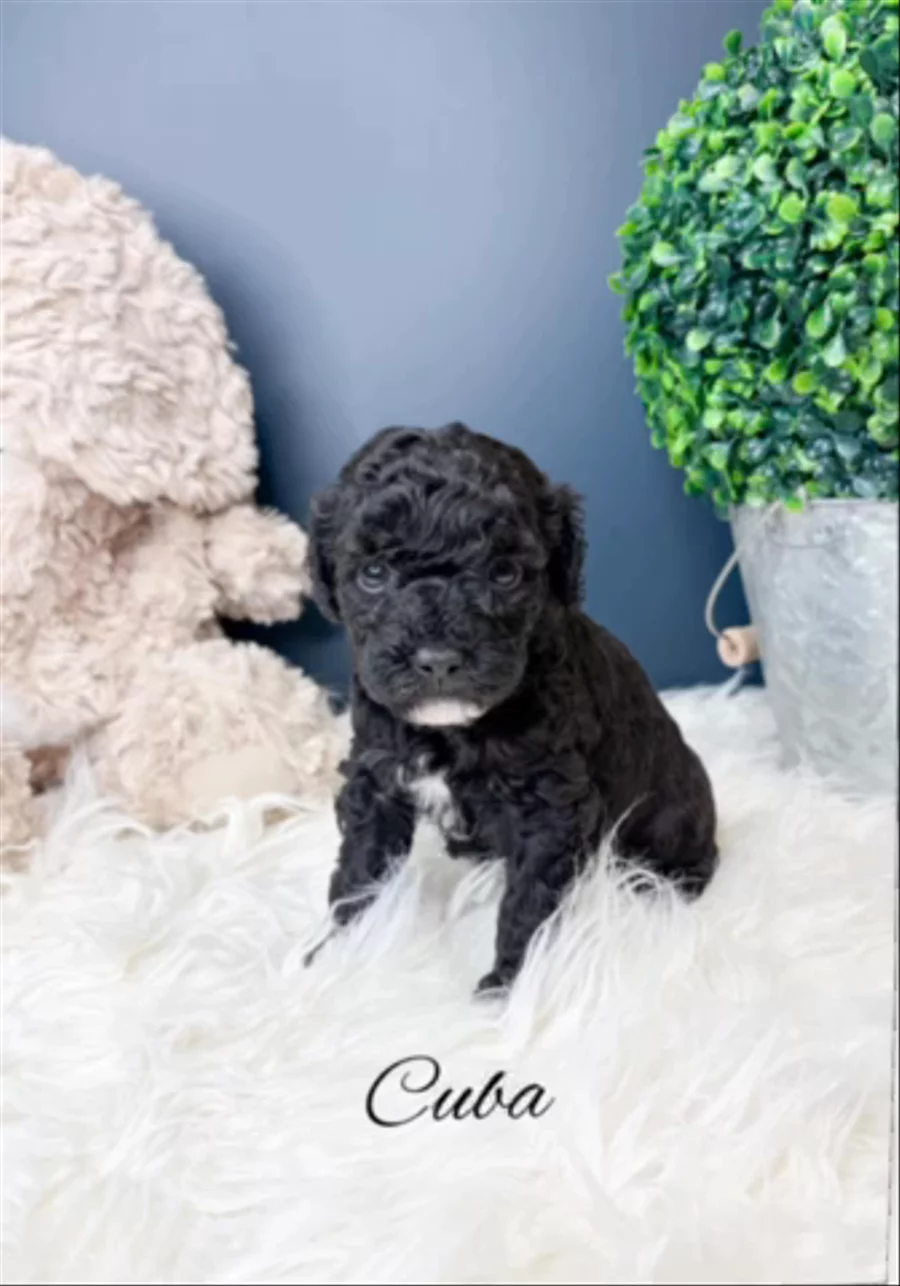 Meet Truffles, a charming chocolate Merle Havapoo whose personality is as sweet as her name! With her soft, wavy coat swirling in shades of milk and dark chocolate, Truffles turns heads wherever she goes. Her expressive hazel eyes sparkle with curiosity and mischief, and her unique Merle markings give her a one-of-a-kind look. Playful, affectionate, and endlessly loyal, Truffles loves cuddling on the couch just as much as she enjoys romping around the yard. Whether she’s showing off her clever tricks or snuggling up for a nap, Truffles brings warmth and joy to everyone she meets.