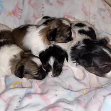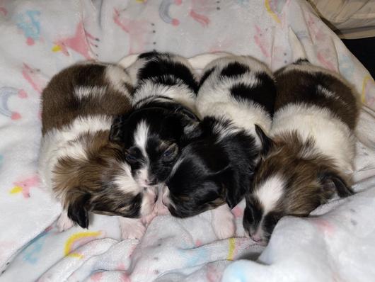 3.5 wk old pups -Macie’s litter- 2 red/white sables (1male & 1female) 2 Tri females. Beautiful markings and coming along just great.