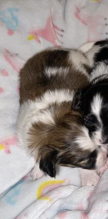 Reba’s female pup- Shady- blk/white sweet little girl. She’s fully vetted and spayed. Gets along with everyone. Ears and coat will be long and fringing galore.