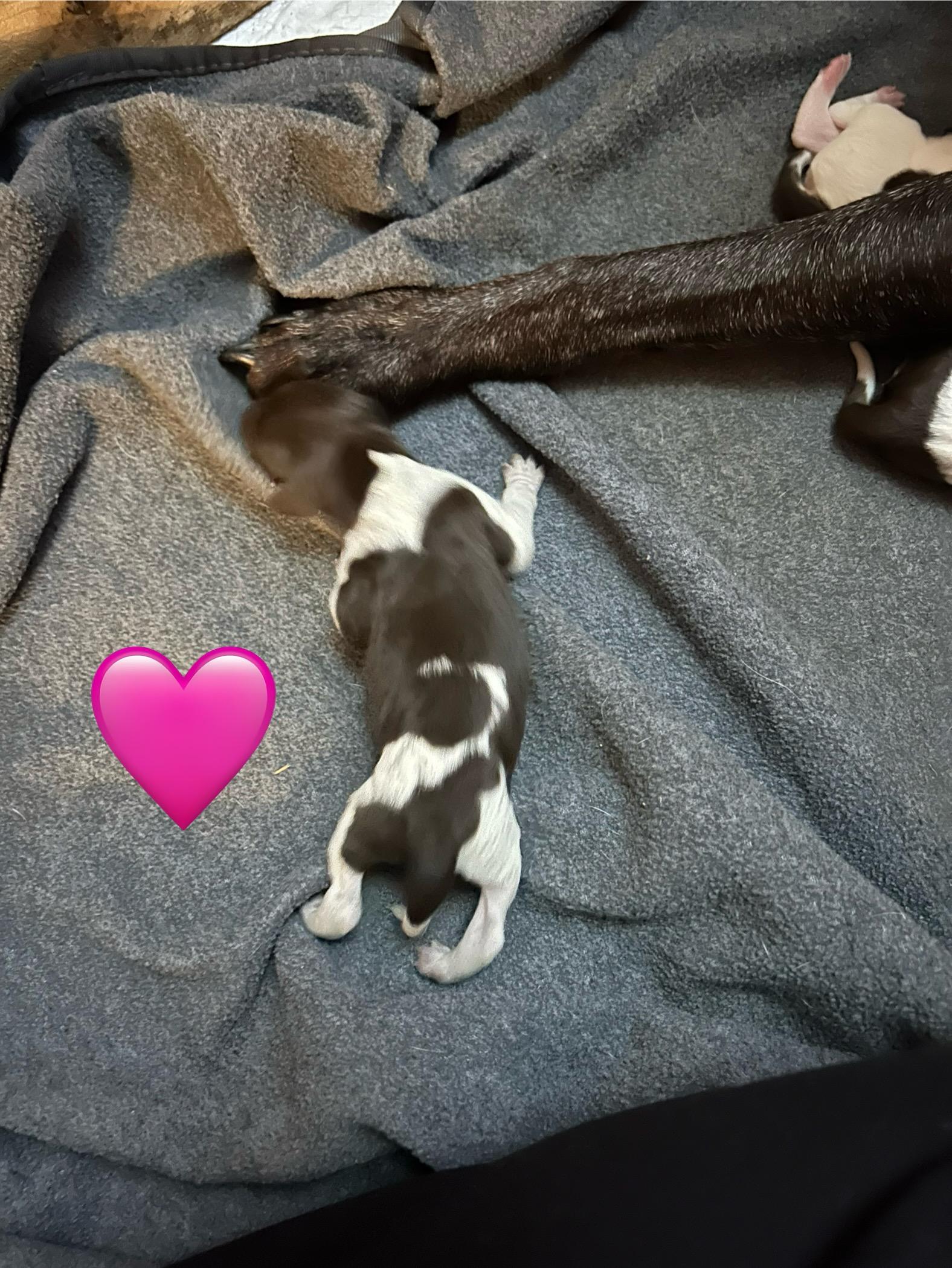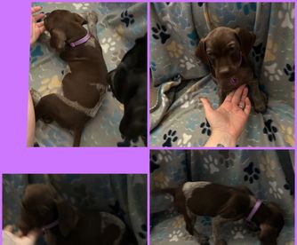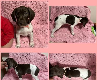 Our puppies include liver roan and liver and white. Colors will vary depending on the parent dogs.