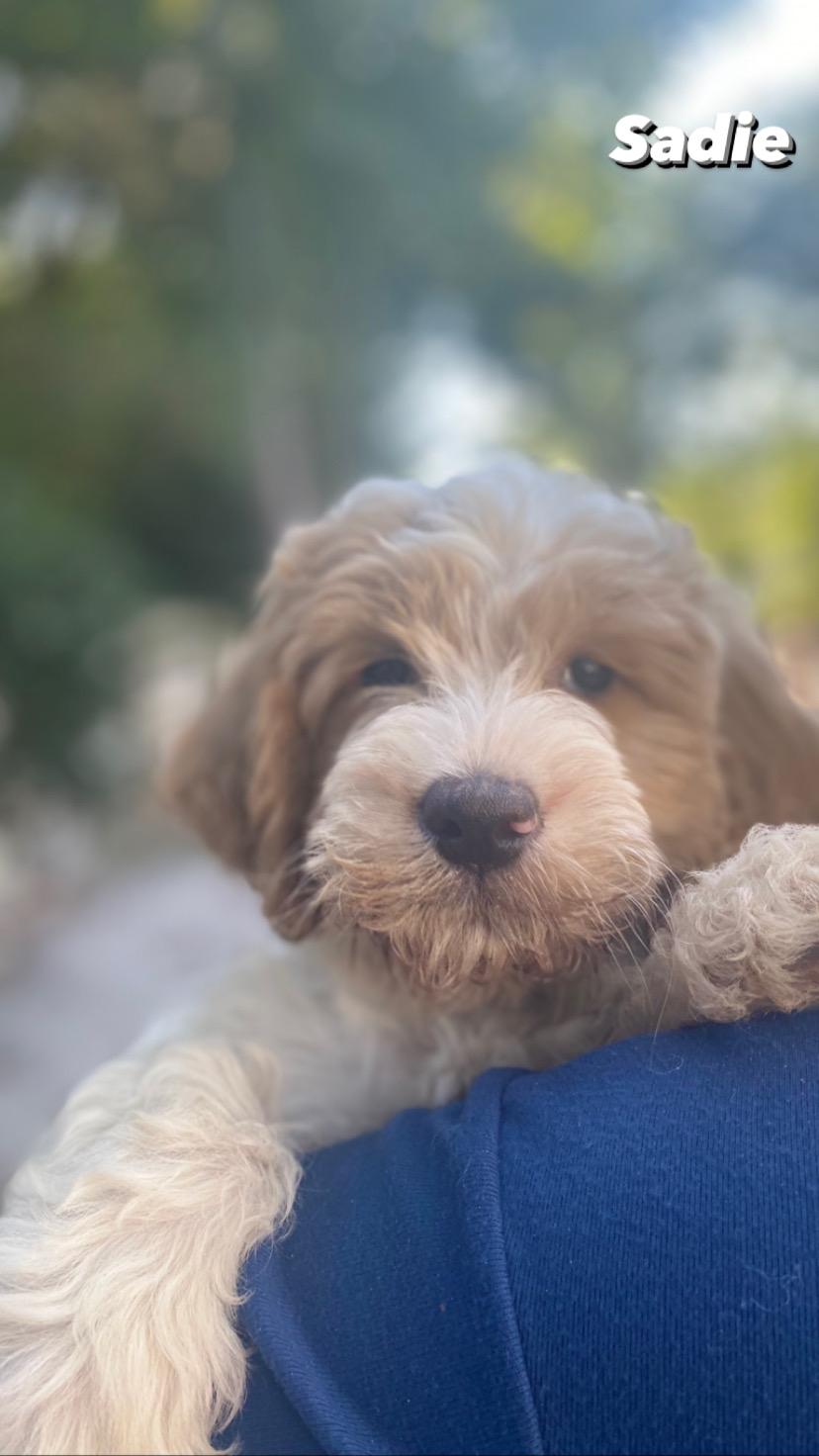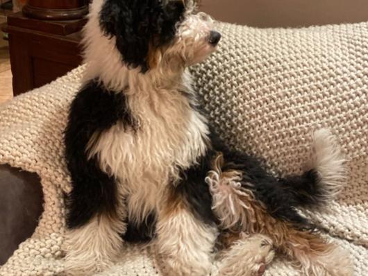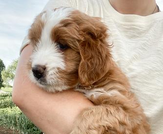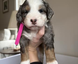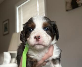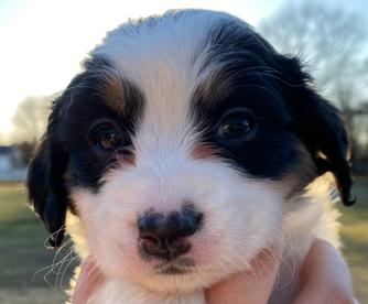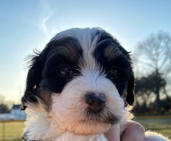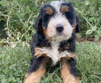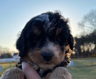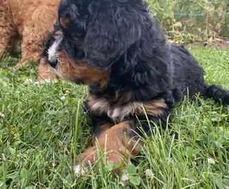 Our Bernedoodle puppies include black, black and white, tri-color, phantom, and merle. Cavachon puppies include sable and white and tan and white. Goldendoodle puppies are apricot. Assorted Doodle Crosses puppies include red phantom, red, chocolate, parti, black phantom, blue merle, merle, and black and white. Colors will vary depending on the parent dogs.