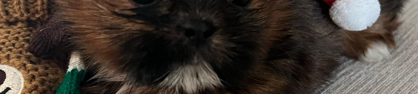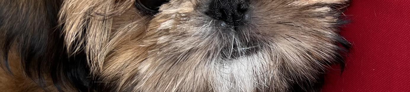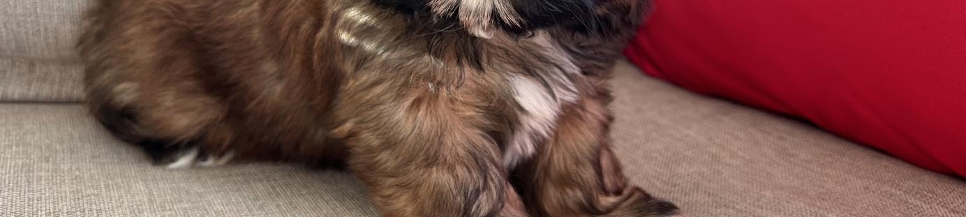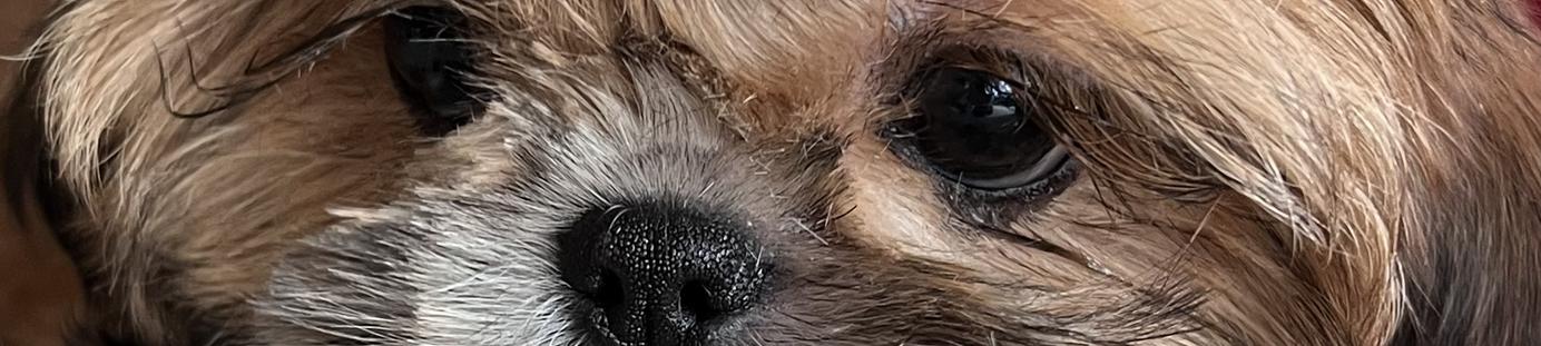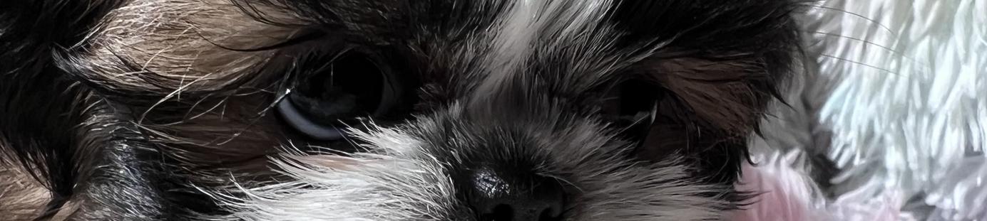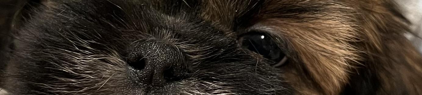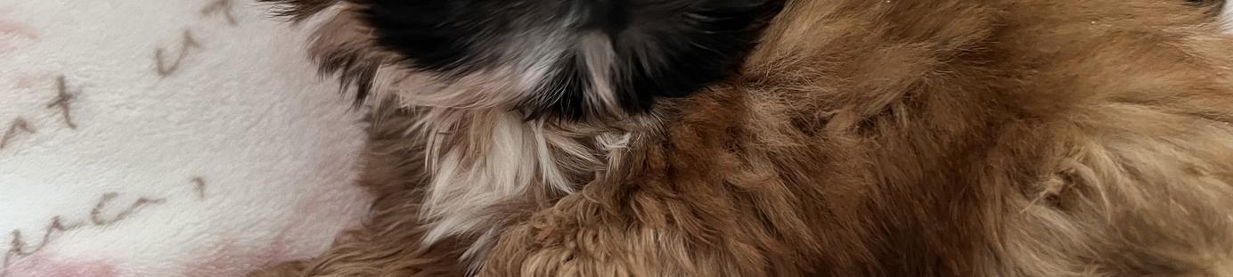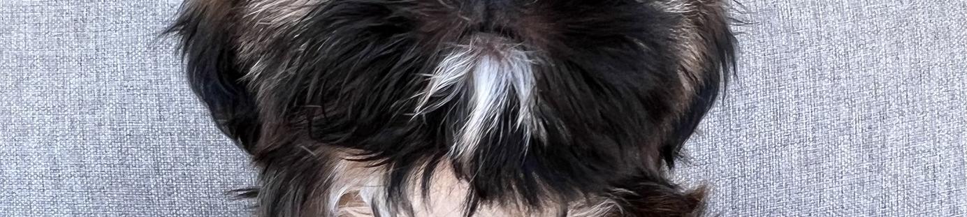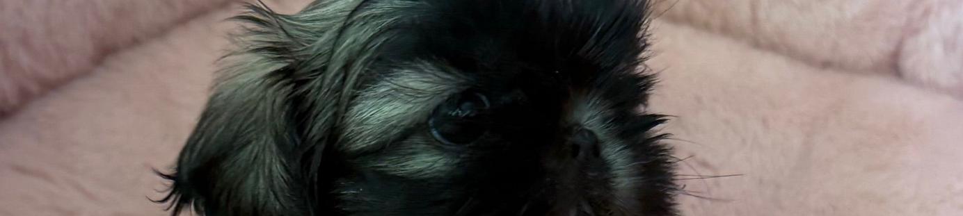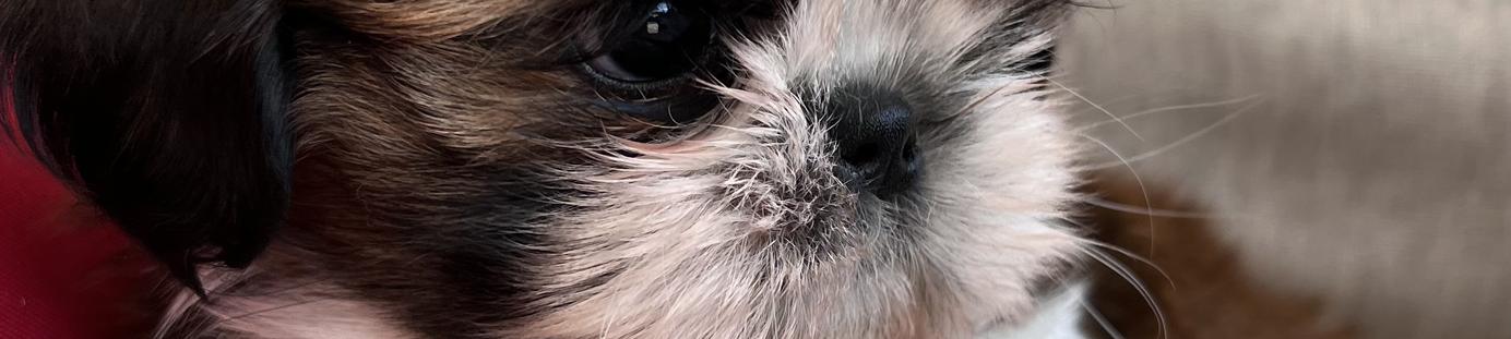 He is everything I dream of in a Shih Tzu! Big, round, dark eyes, gorgeous, inky black pigment, soft and beautiful gold coat, with black markings. He is the perfect size weighing in at 7lbs.