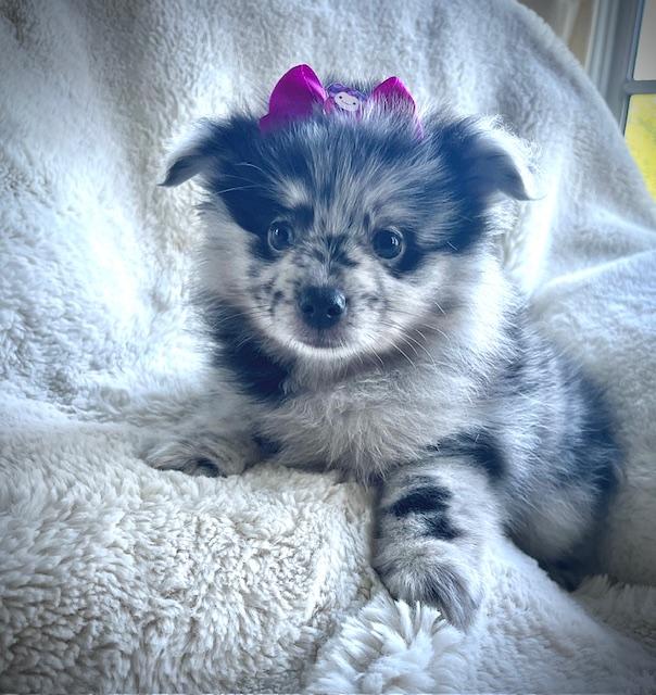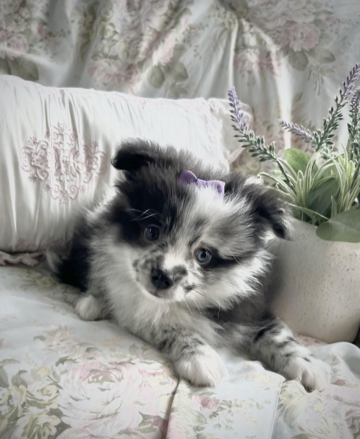 Edie💙is a blue merle female with blue and green eyes. Chippy💜is lavender Merle Male with gray eyes