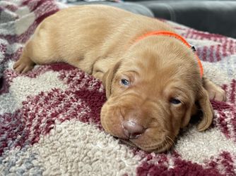 Gage is a male Vizsla. Carefully selected as a great representative of his breed, Sara decided to make him part of their program. Sara has passed Good Dog’s screening process, which involved a review of their breeding practices, environment, and the mental and physical health of their dogs.