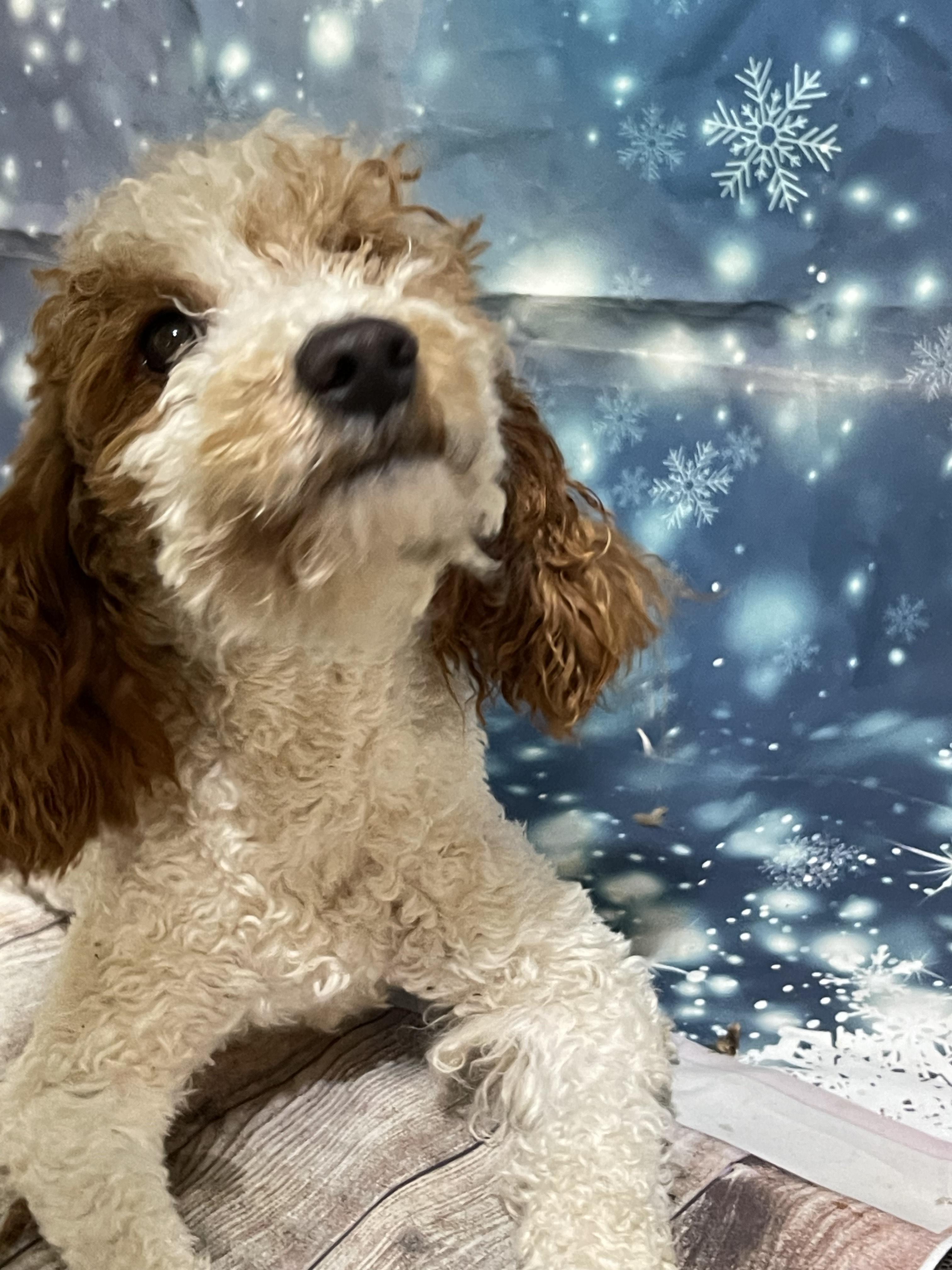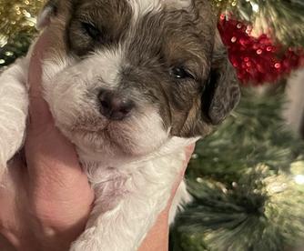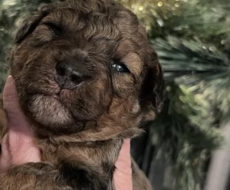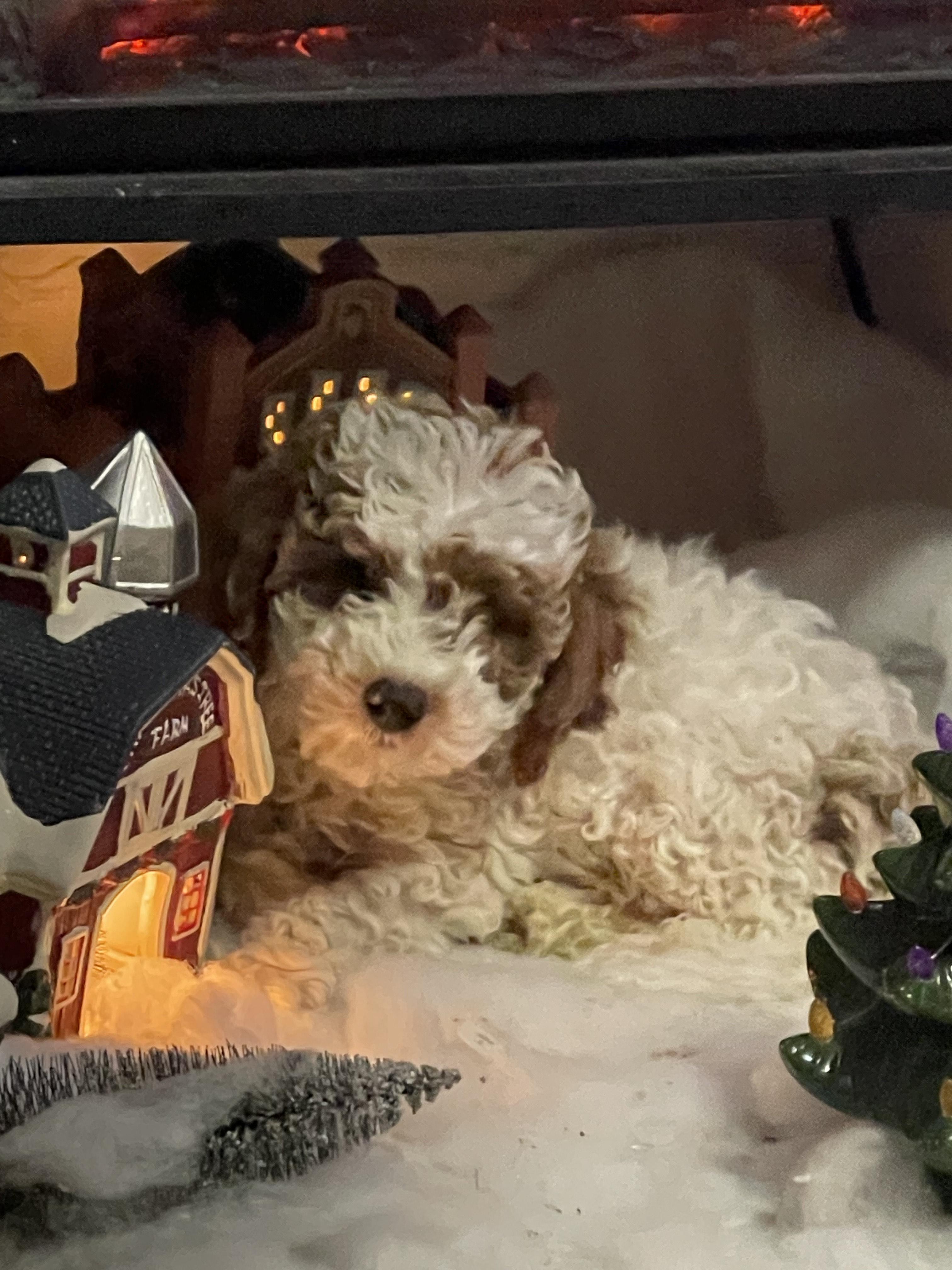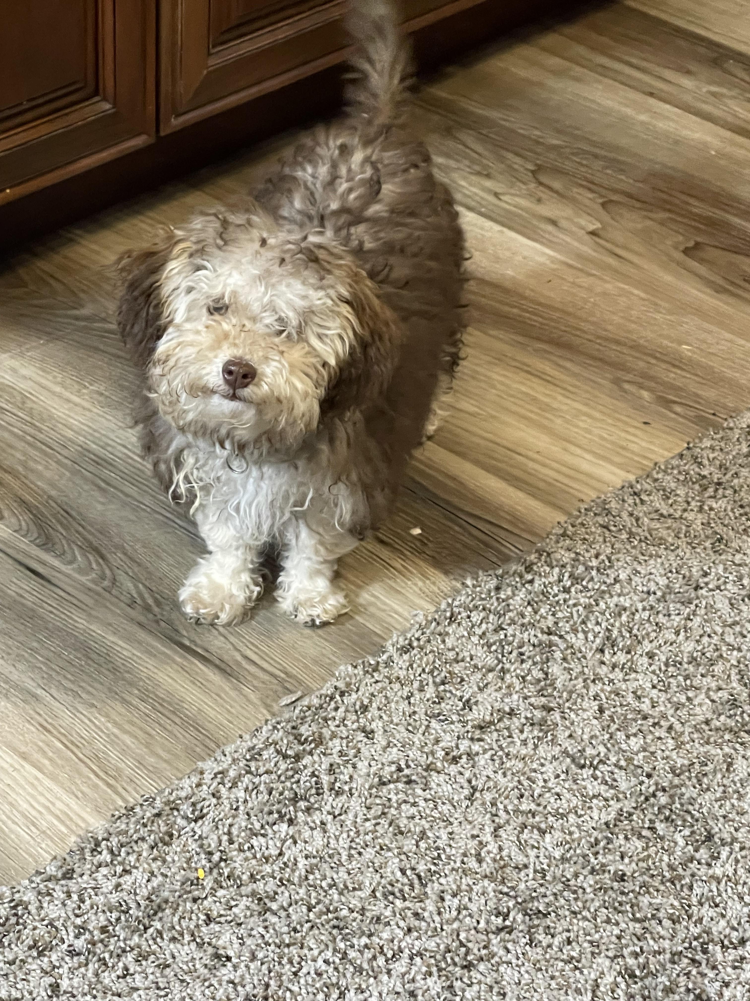 Appletini is a very petite goldendoodle . Her coloring is very unique she is a chocolate sable phantom .