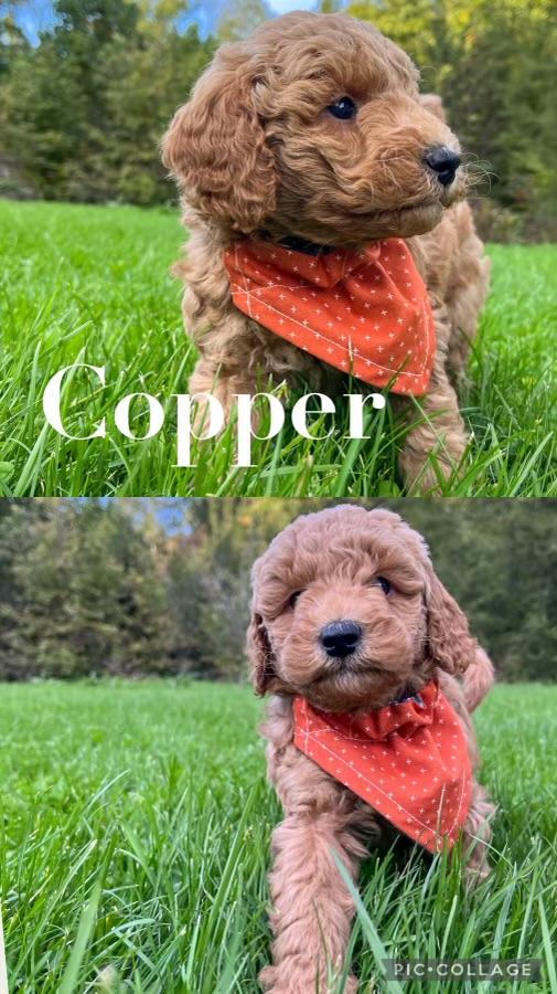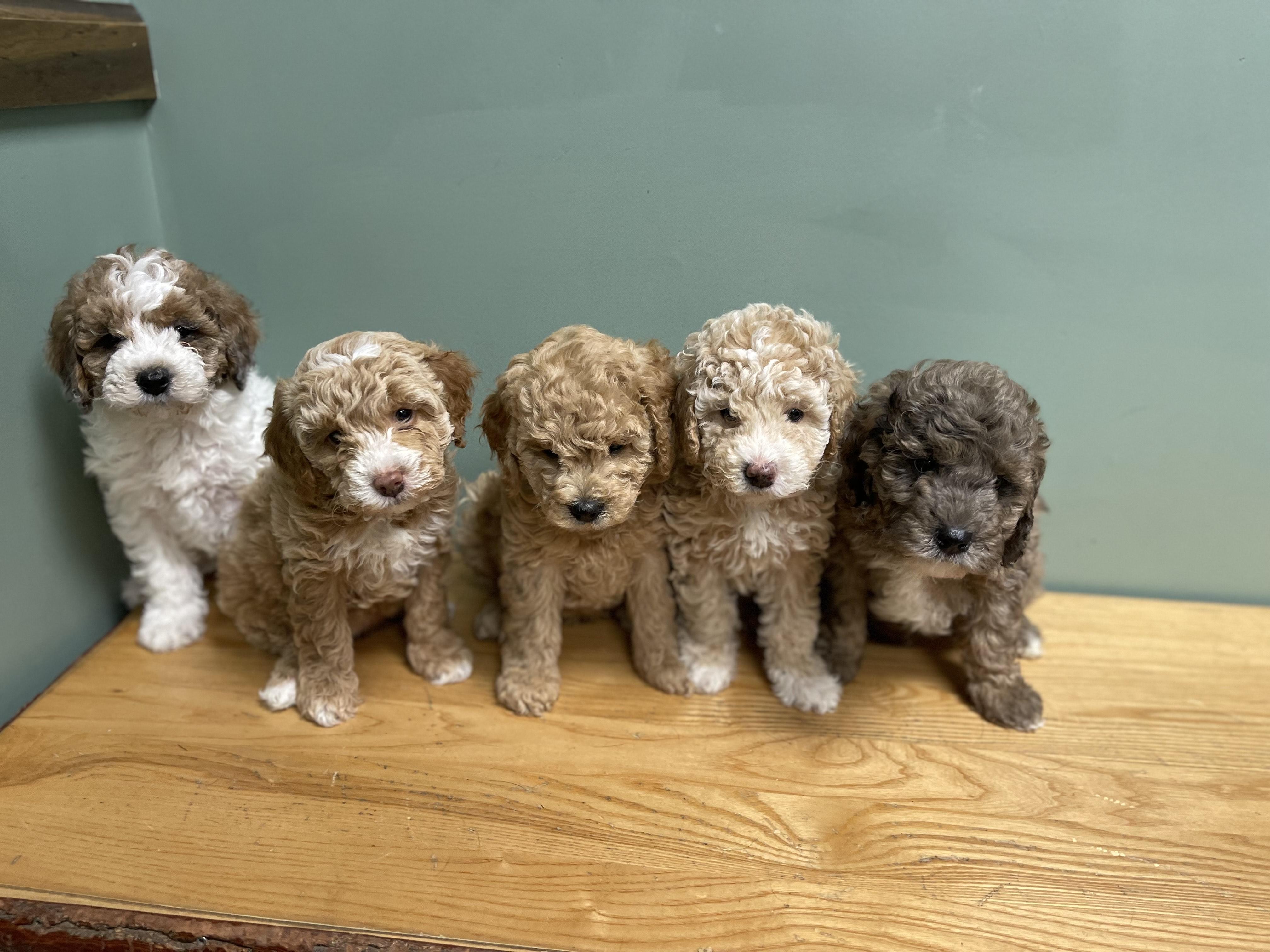 Our Goldendoodle puppies include cream, apricot, red, phantom, merle, and parti. Irish Doodle puppies include red and apricot. Colors will vary depending on the parent dogs.