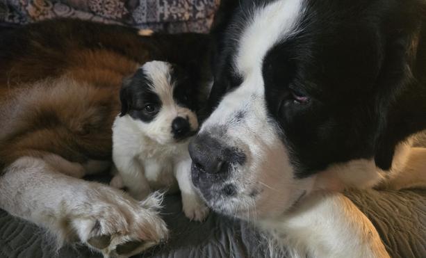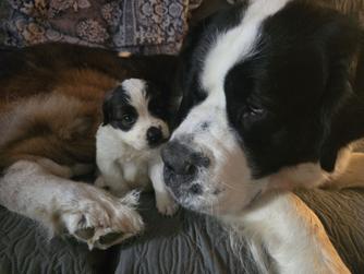 Ell is our big loving gentle gaint saint bernard momma. She loves to lay by our feet and get belly rubs and attention.