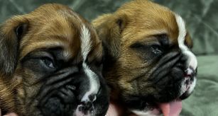 Our Boxer puppies include fawn and brindle. Dalmatian puppies are white and black. Colors will vary depending on the parent dogs.