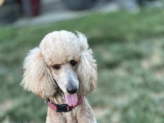 Rubi is a beautiful, standard poodle. She is well-mannered and has done some agility training. She enjoys pleasing me and meeting new people. She in not a barker or aggressive at all. She teaches her puppies to be the same, kind, sweet dogs.