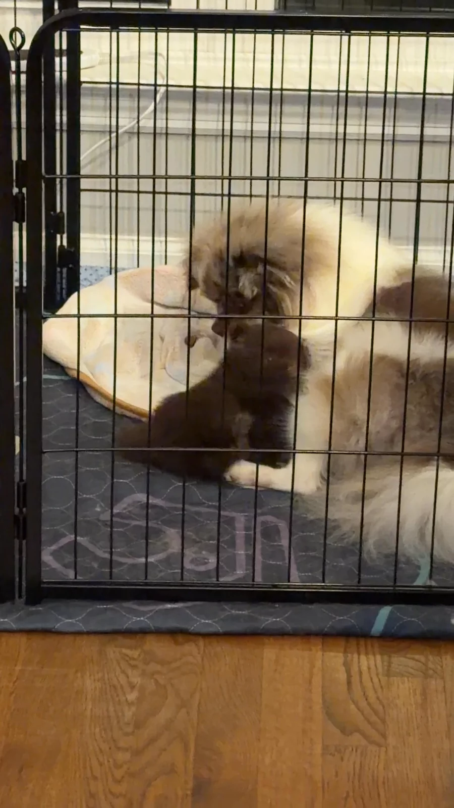 Reese Cup is a chocolate tri Merle with tan points. She has a blue fleck in her right and is AKC registered. Her disposition is amazing. She is a sweet girl and a wonderful momma.