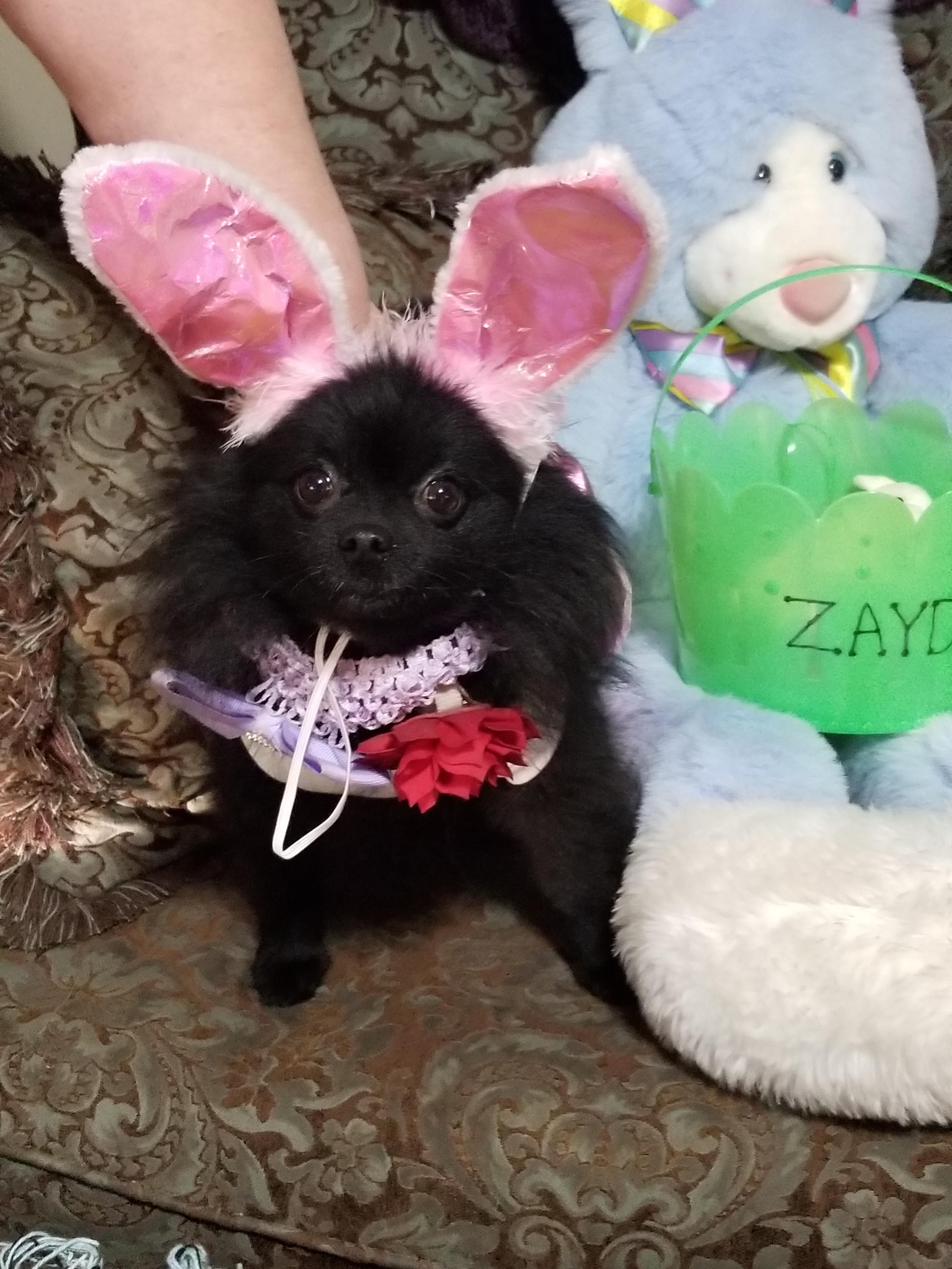 Zaydi is a very sweet solid black pomeranian who weighs 5 lbs. She has the short back and the perfect shape for a pomeranian.