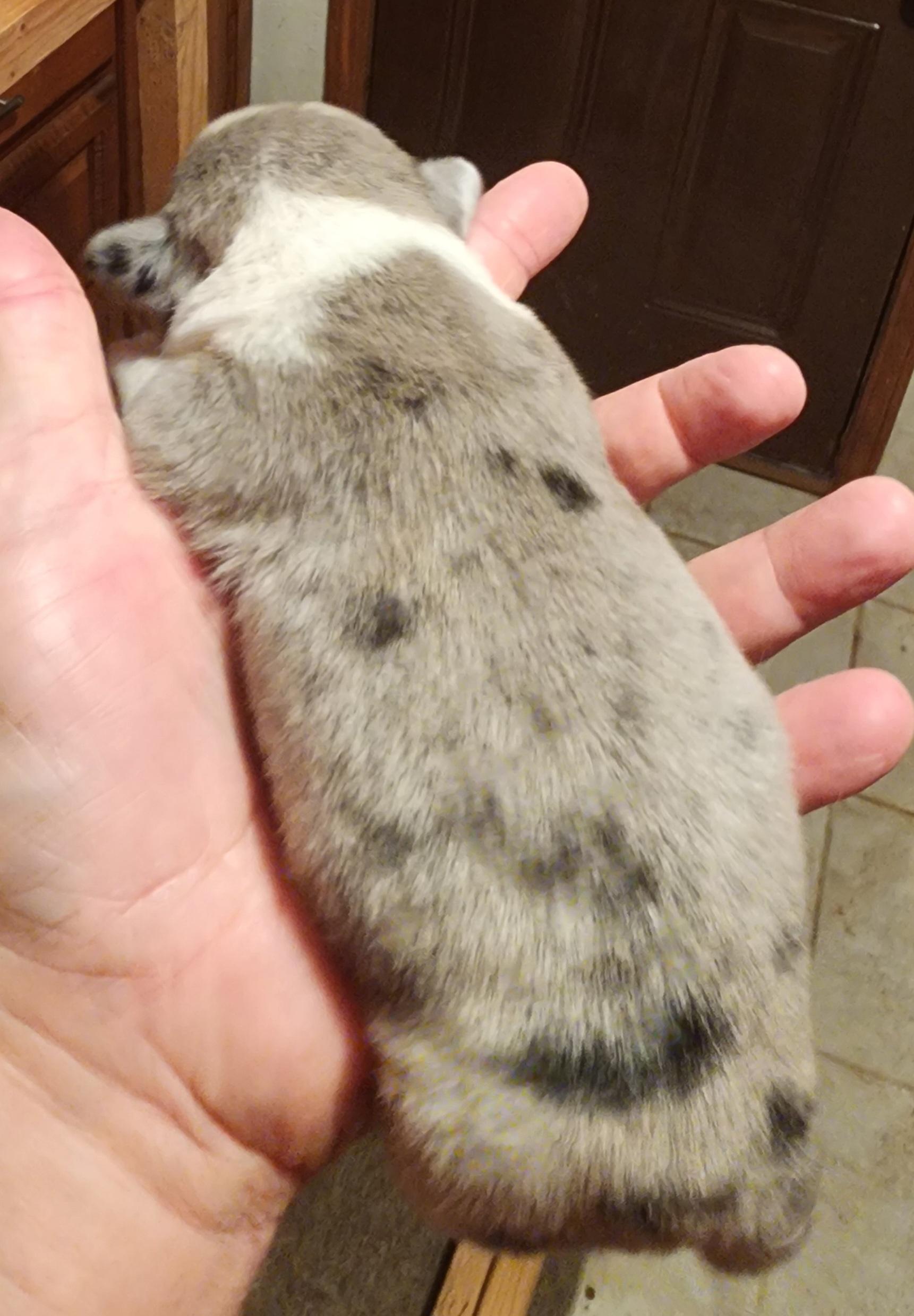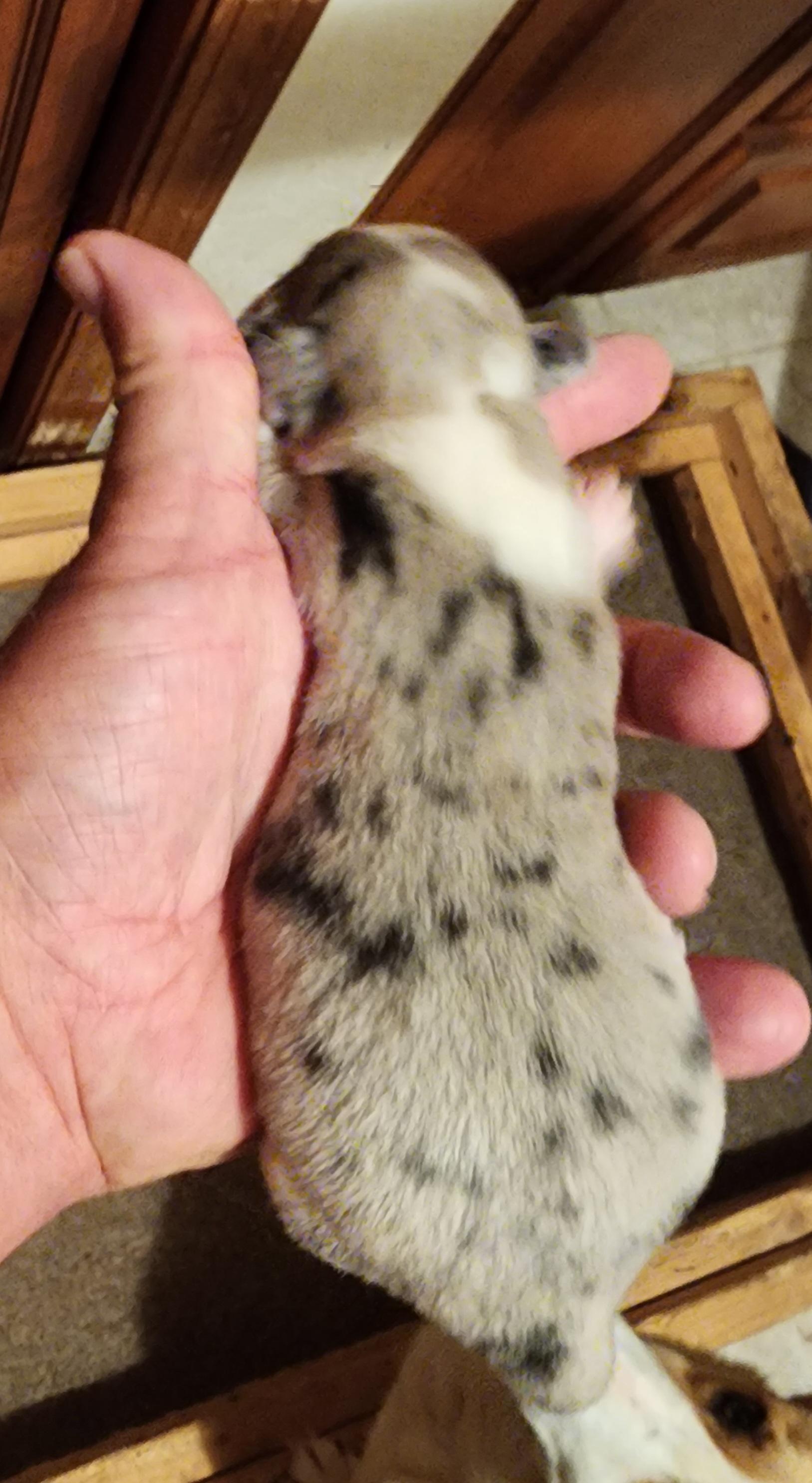Grace is a beautiful, small, minimally marked, red merle. She is so minimally marked that she did quite well in the show ring, having won her majors and 11 points towards her champion. She is a phenomenal mom and had a very easy birthing. She loves attention from pretty much anybody.