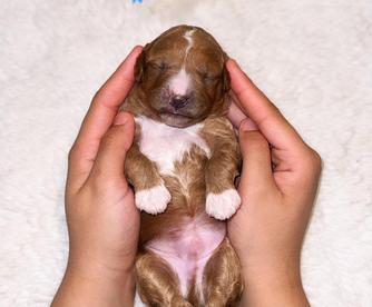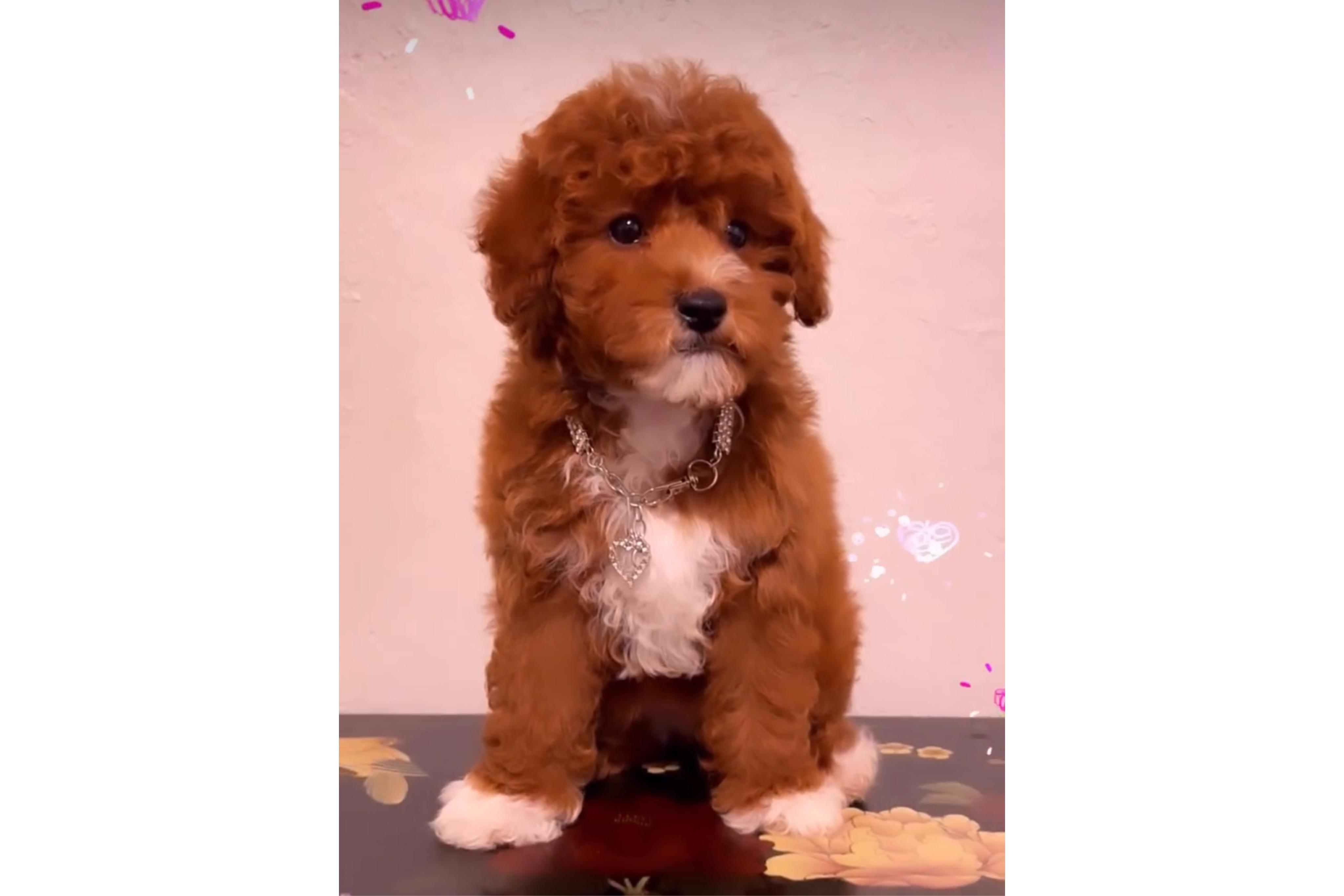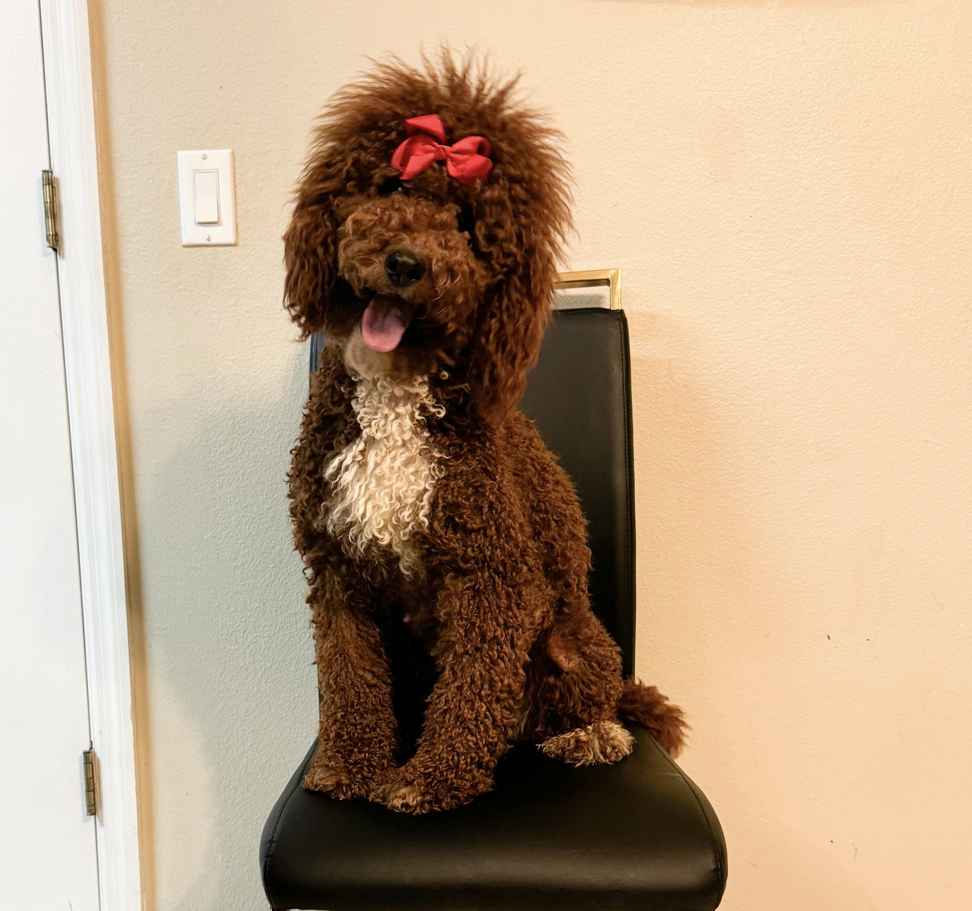 Bella is a beautiful dark red F1bb Goldendoodle with white markings. She is loving & very smart. She has a beautiful curly coat.
