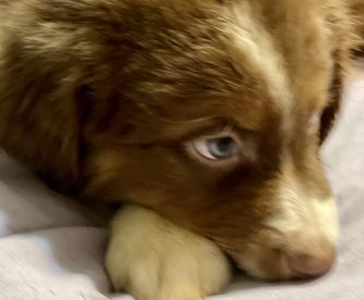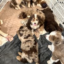 Our Goldendoodle puppies include cream, red, chocolate, black, and merle. Aussiedoodle puppies include blue merle, red merle, black and white, black tri-color, and red tri-color. Colors will vary depending on the parent dogs.