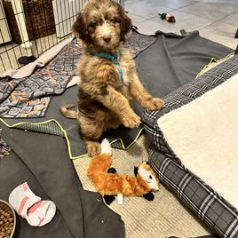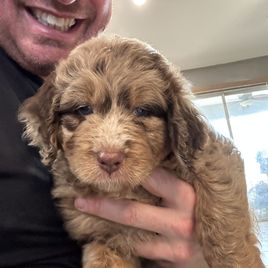 So I started looking for Aussie-doodles online and found this site via google. I noticed that I lived near Terri and Bob before I bought my little man so I was able to go out to their place and meet the doggy parents and the pups. They take great care of their dogs and I am glad I got to see that. Air-con garage, 3 lot fenced in backyard and 2 full bedrooms for the puppies. They let me come out a couple times before I picked up my puppy ( I had to sterilize before entering) and I got to hold and play with him , for this I am truly grateful. Barnaby is now 1 year old, he is such an amazing little boy. I have no issues with them and I still stay in contact with Bob and Terri .. My dad and stepmom are named Bob and Terri soo I think this was meant to be...:) If you are wondering about this breeder, they are good people who take care of their dogs and have been doing this for over 20 years. If you have any questions they are more than happy to answer them and they are truly knowledgeable. Why I really trust these 2 is because I originally had a puppy picked out and after a few weeks Terri called me and expressed concern as the puppy was not growing like the other ones. I wanted a standard Aussie-doodle and she was worried about this dog not being standard but a moyen. So she sent off for a few of the dogs to be tested and she was right.. I actually waited for the next litter to pick my little boy. One of the times I went out to see Barnaby the original dog I had picked was at her house (her daughter took her) and Terri was sooo right.. Blew my mind she could tell from a 6 week old puppy how big it would get. This post is probably way too much information but truly grateful for you 2, Thanks for giving me a great little man.