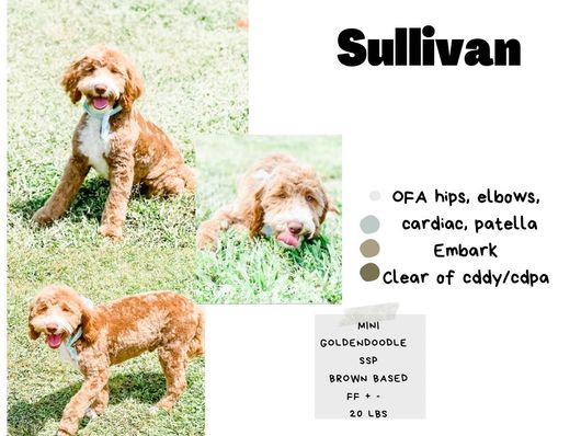 Goldendoodle puppies include petite, miniature, and medium sizes. Sheepadoodle puppies are miniature size. Sizes will vary depending on the parent dogs.