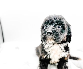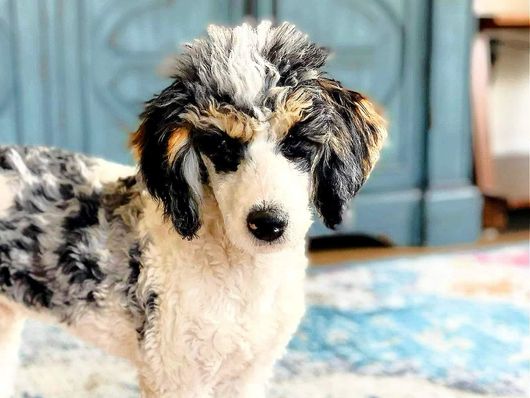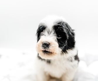 Sheepadoodle puppies include blue merle and white, black, and black and white. Colors will vary depending on the parent dogs.