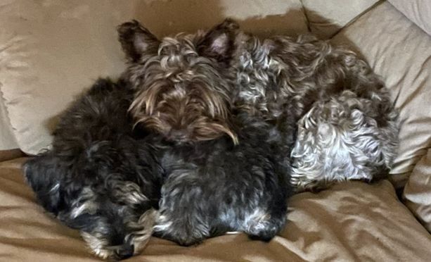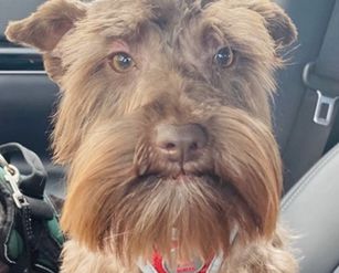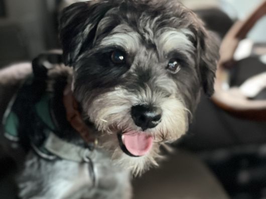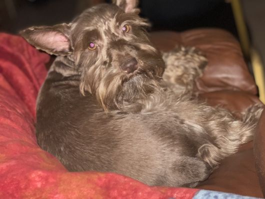 Hazel is a sweet Liver Miniature Schnauzer. She loves to play and snuggle. She definitely runs the house!