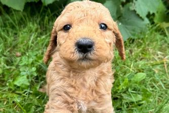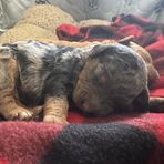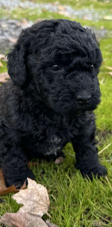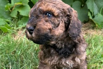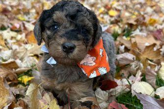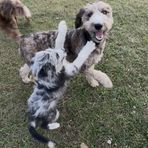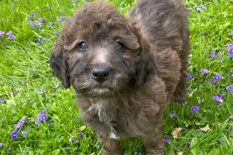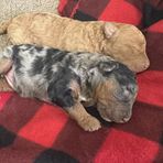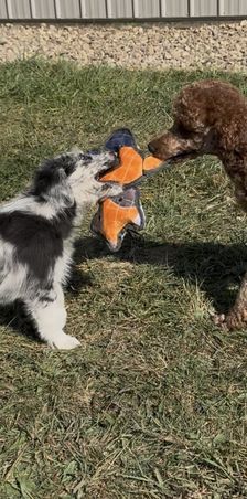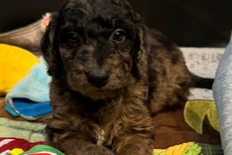 Our Bordoodle puppies include sable, white and blue merle, white and red merle, white and black, sable merle, red, red merle, gold, brindle, blue merle, and black. Poodle puppies are red. Colors will vary depending on the parent dogs.