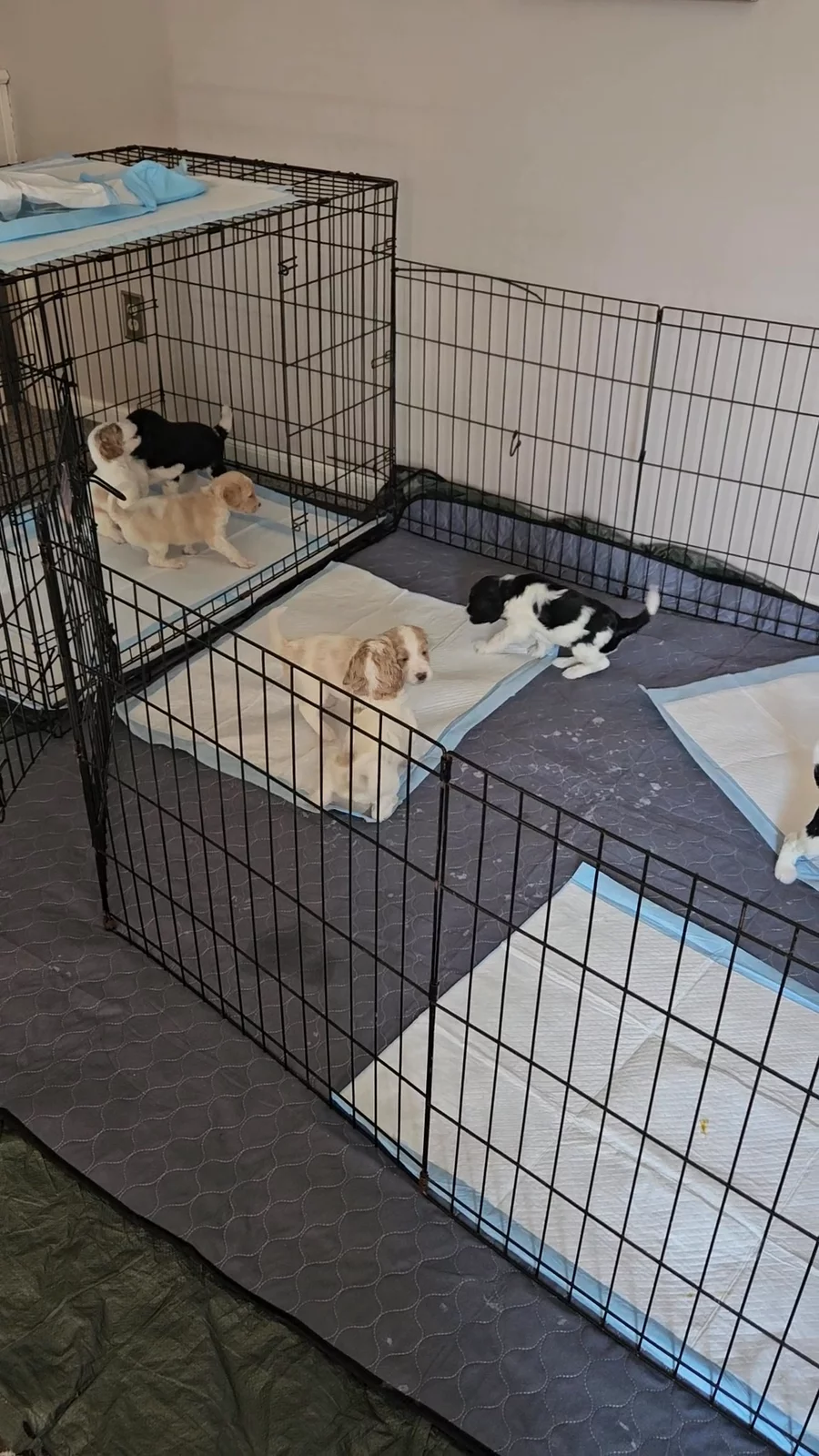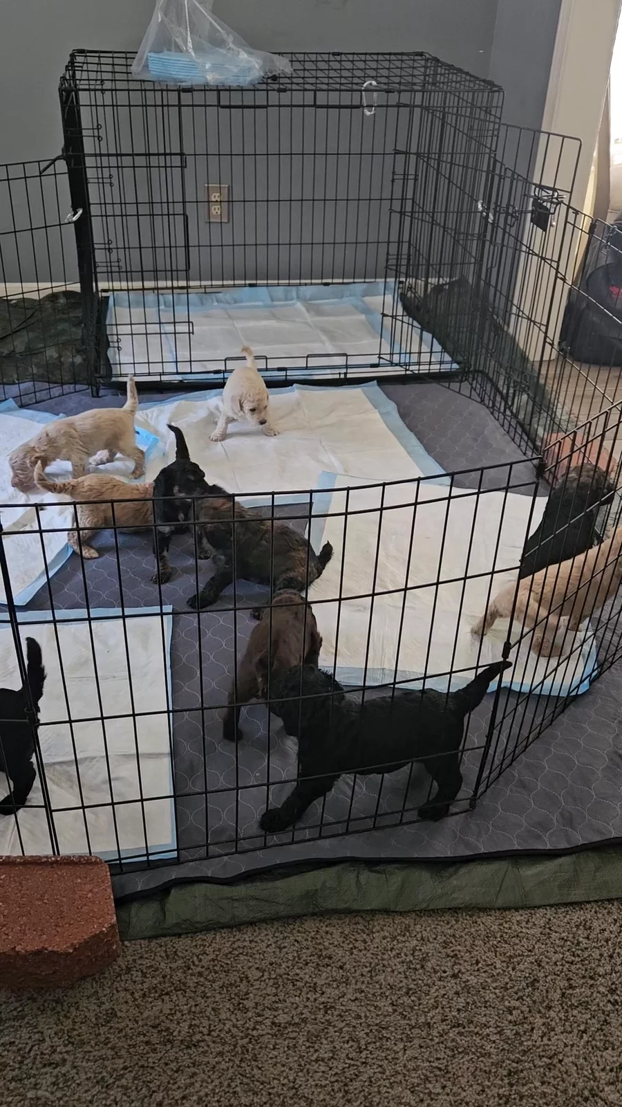 Puppies have graduated to the bigger pen!! They are playing so good! Doing really well on puppy food. Weaning off mom, they still want some nursing time with her. It is getting less though each day!