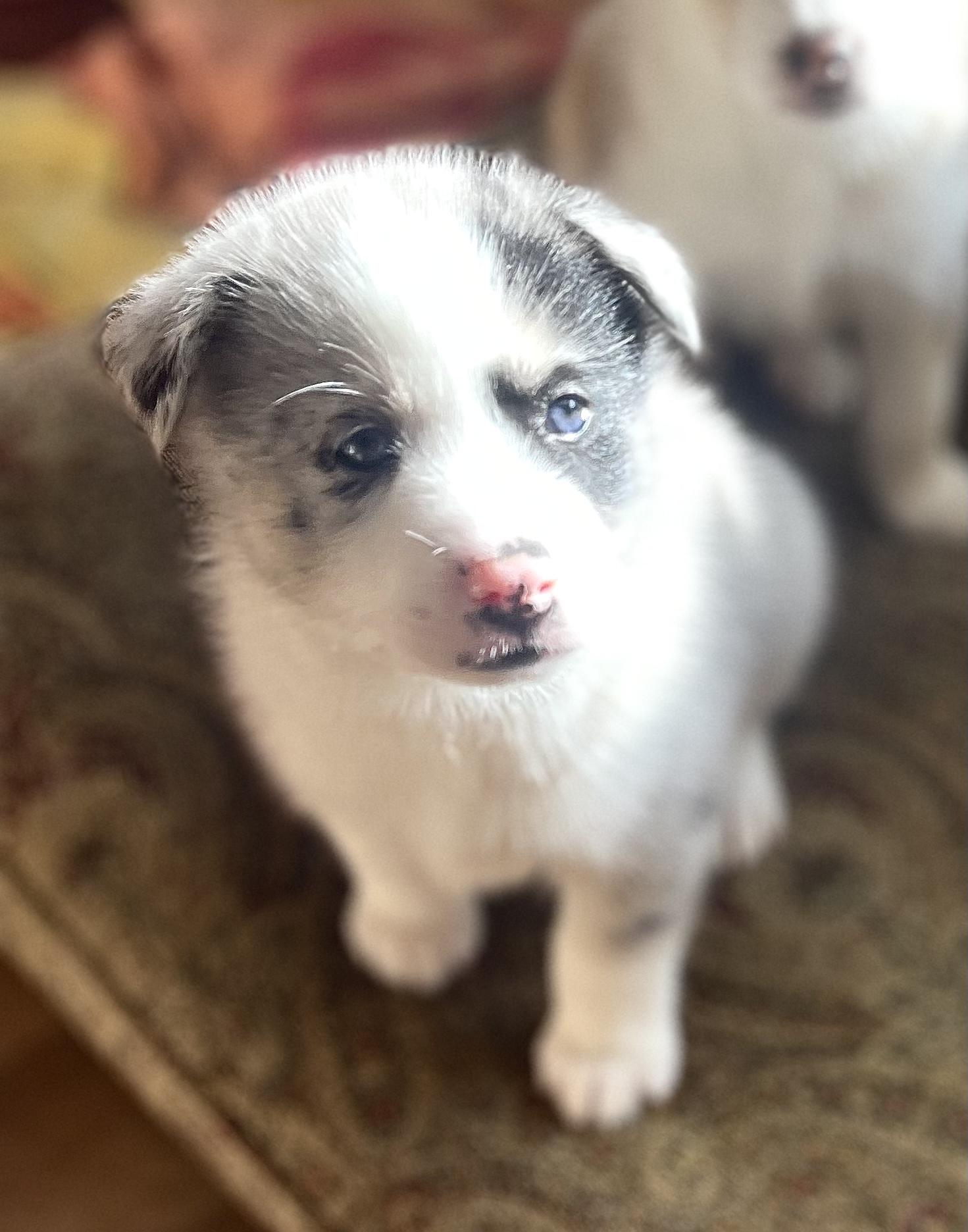 Our puppies include blue, black and white, and merle. Colors will vary depending on the parent dogs.