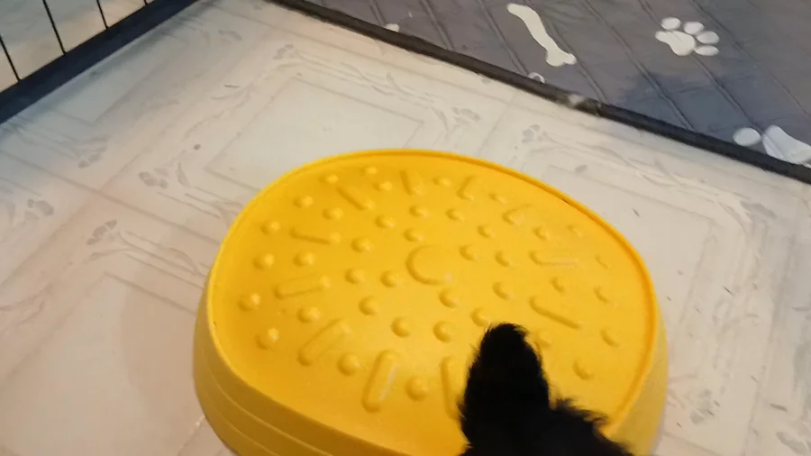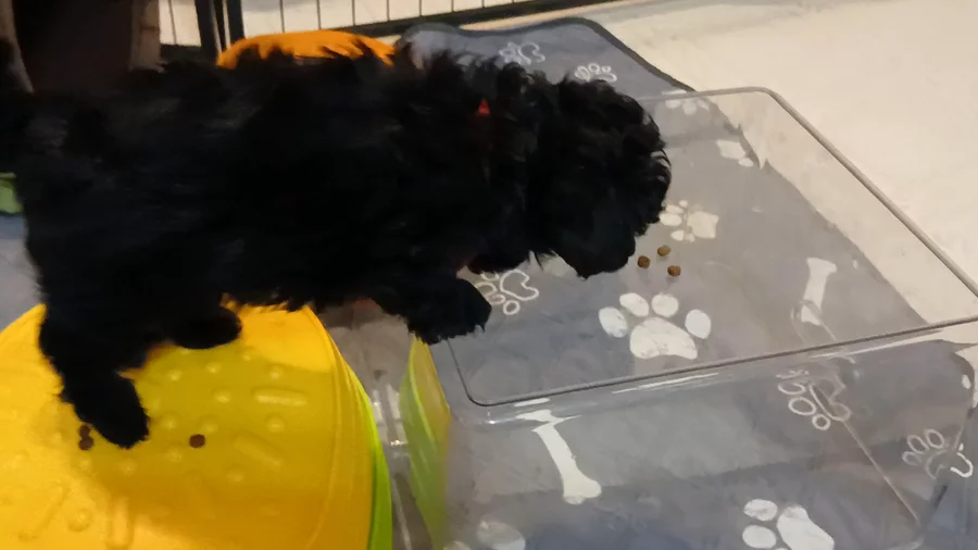 **click on the video to see all of it* I put the adults out of the kitchen, turned around and discovered the puppies on the turtle shells looking at me. They waited for me to sit down and we played our "place" game. I set up the shells + box to simulate stairs so the puppies won't stress too much about steps when the time comes. I let them solve their problems for themselves and praise them when they do well.