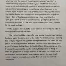 I have spent a lot of time developing a successful potty schedule for my puppies. The schedule revolves around their nap times. A crate is used and kept comfortable with a washable pee pad, blanket, and toys. The puppies eat in the crate and drink out of a bunny bottle (they use a bowl, too). I also begin the grooming process so it won't shock the puppy when it finally goes to a groomer.