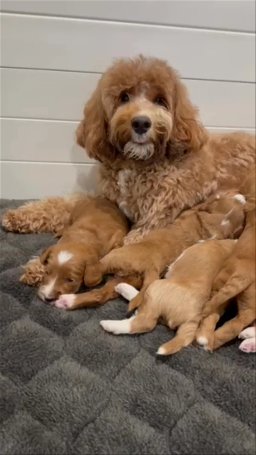 Luna nursing her adorable puppies! She has officially started the weaning process as her puppies are now on puppy mush. 🐾❤️