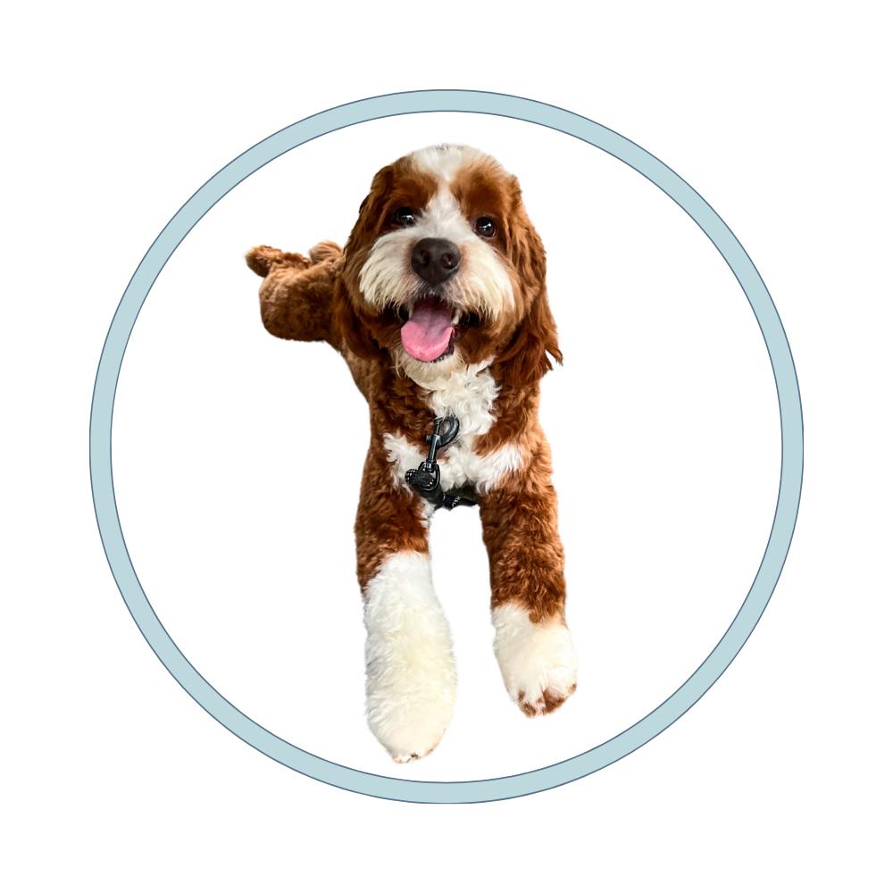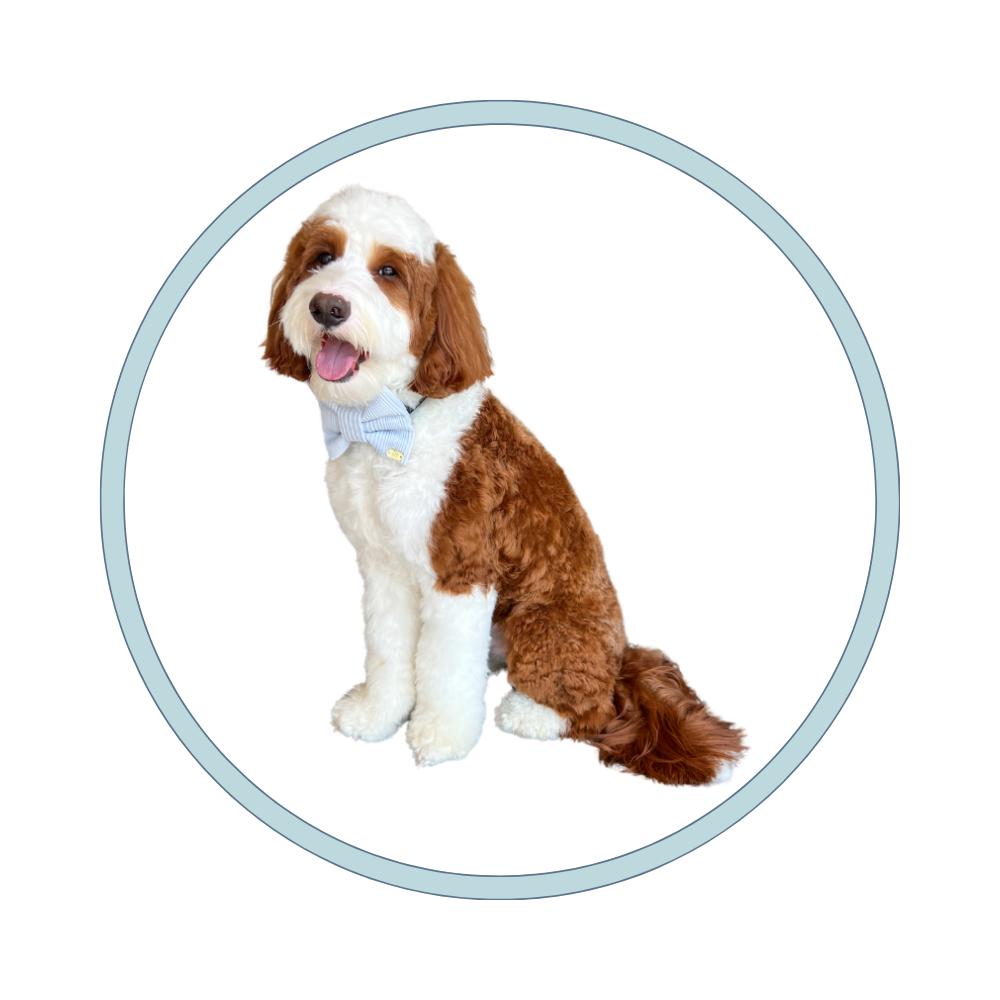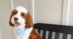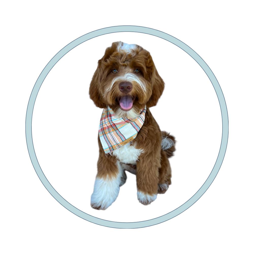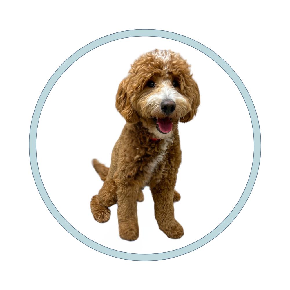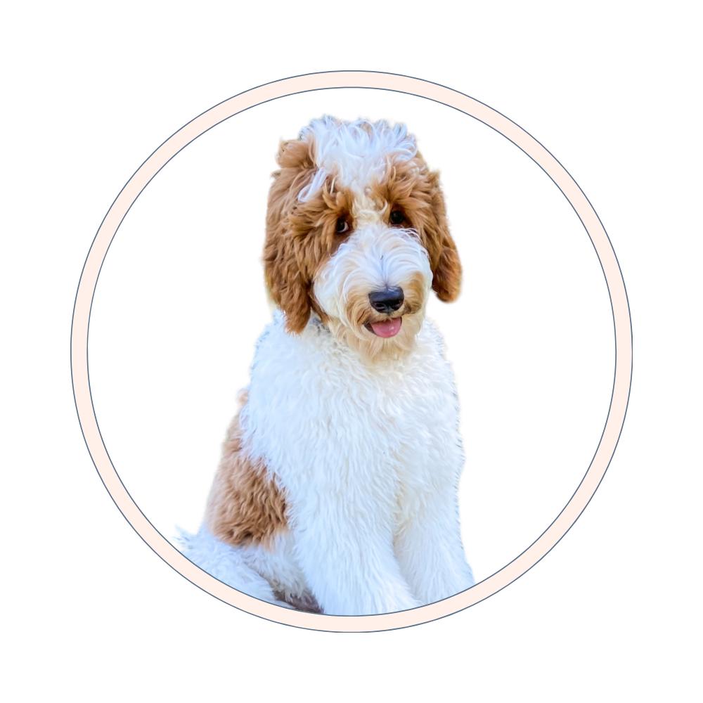Miller is our new handsome addition here at PPD! He is a Petite Mini Multigen Goldendoodle and the son of our very own Brody Liam. He is confident, daring, playful, very friendly, and intelligent. He is currently 23 pounds and has a very well-balanced stocky build. Genetically, he has a fleece wavy coat, but he undeniably inherited less curl due to his Dad's DNA. Miller has an adorable liver nose and amber colored eyes, along with distinctive white markings.