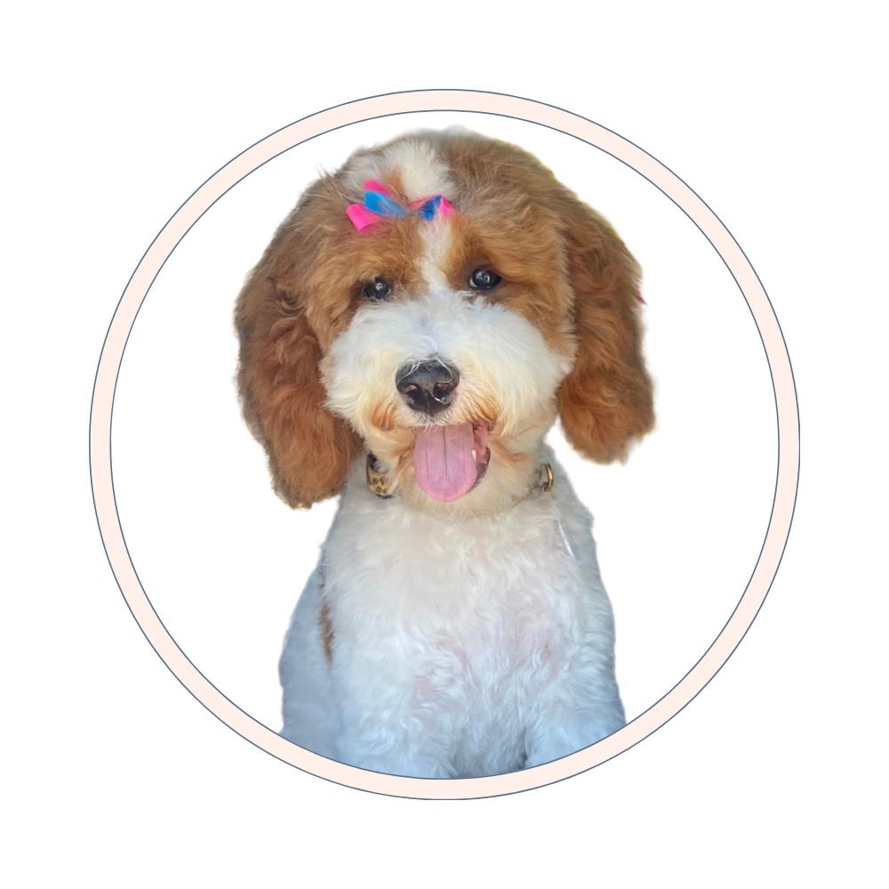 Dolly is our precious Miniature Multigen Goldendoodle that we held back from Brody and Willa's litter. She has matured to 35 pounds and has a beautiful, loose wavy coat with abstract markings. Dolly also has a liver (chocolate) nose and stunning amber colored eyes. She is human focused, sweet natured, and intelligent. She lives a very spoiled life with her Guardian family here in Middle TN.