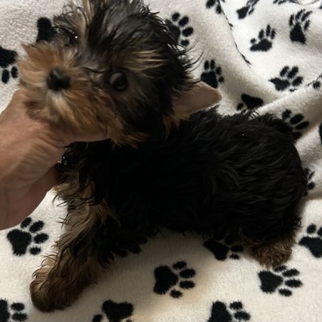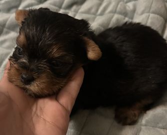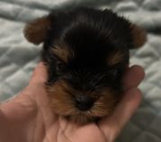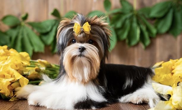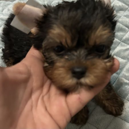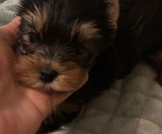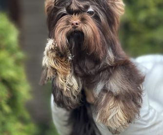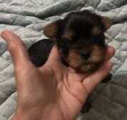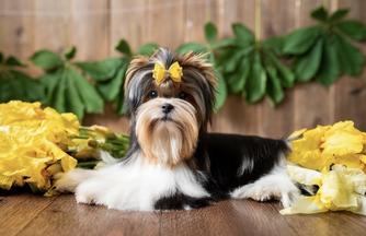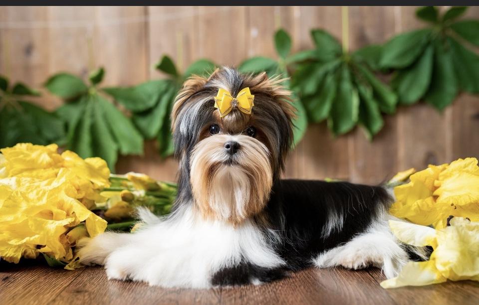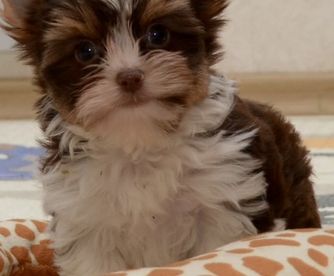 Our Biewer Terrier puppies include chocolate tan and white and black tan and white. Yorkshire Terrier puppies include liver, chocolate and tan, blue and gold, and black and gold. Colors will vary depending on the parent dogs.